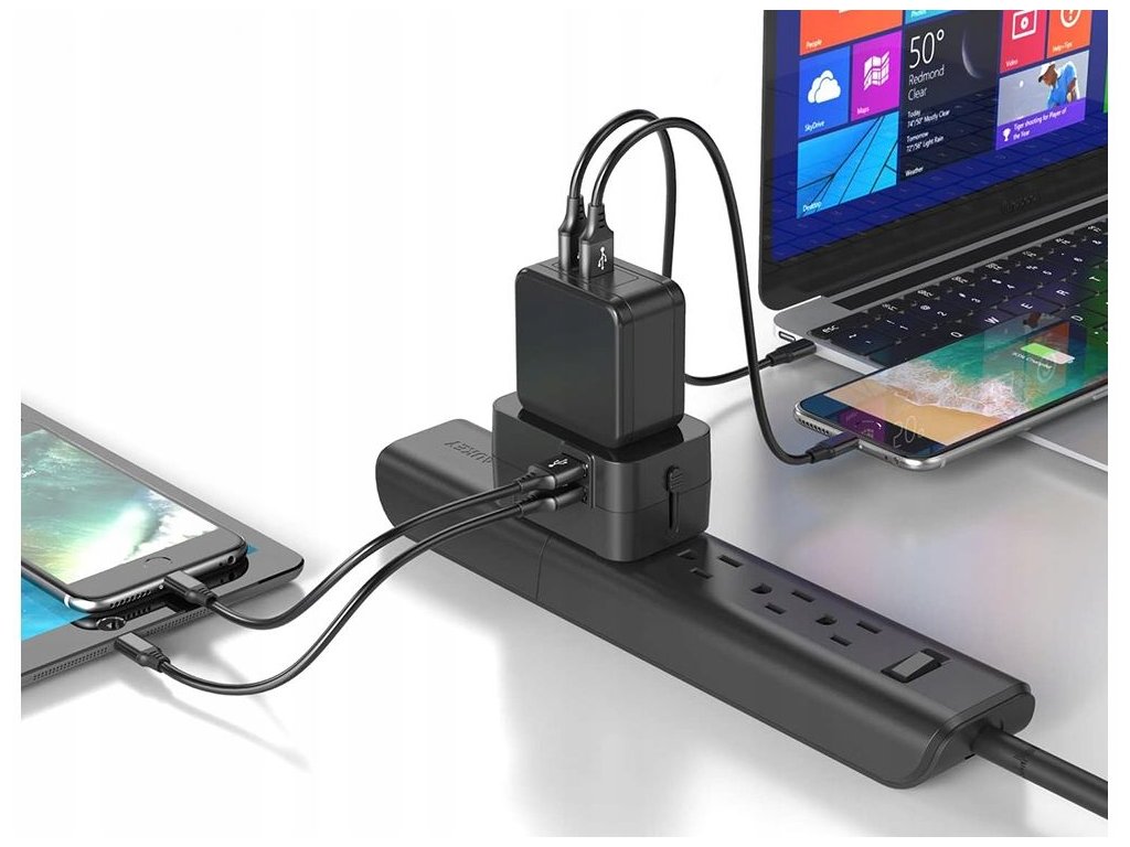 Adaptér podporuje různé typy zásuvek, což vám umožní nabíjet smartphony, tablety, notebooky a další elektronická zařízení. Všestrannost v jednom malém zařízení.