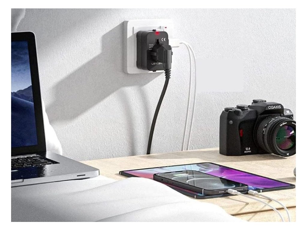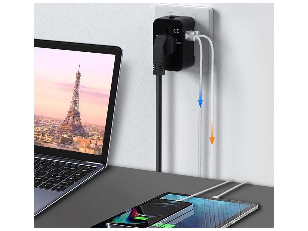 Adaptér podporuje různé typy zásuvek , což umožňuje nabíjet smartphony, tablety, notebooky a další elektronická zařízení. Všestrannost v jednom malém zařízení.