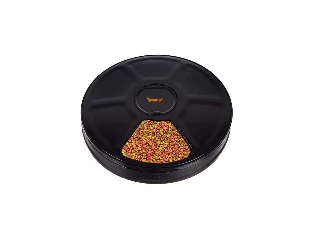 - 6 BUNĚK – miska má 6 komor o objemu každé 150 ml. 5 je zakryto a jeden je otevřený. Systém časovaného otevírání při otáčení víka otevře jednu komoru s jídlem v daný čas .
