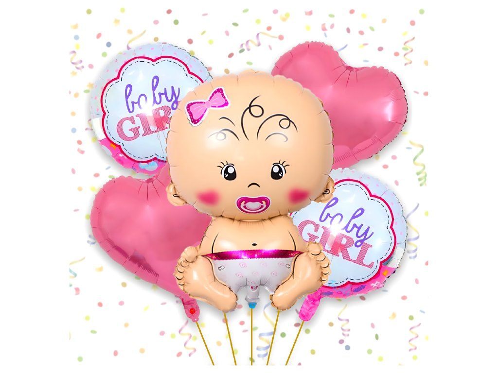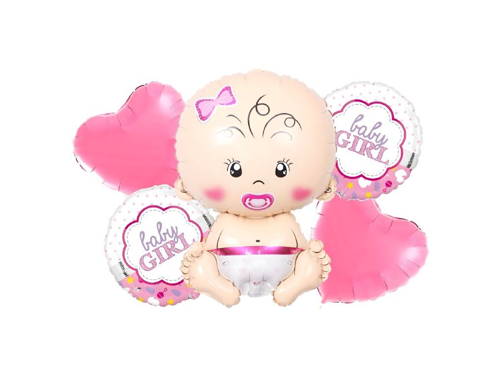 Kompletní sada 5 fóliových balónků – obsahuje miminko, hvězdičky a nápis „Baby Girl”.