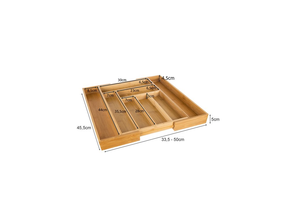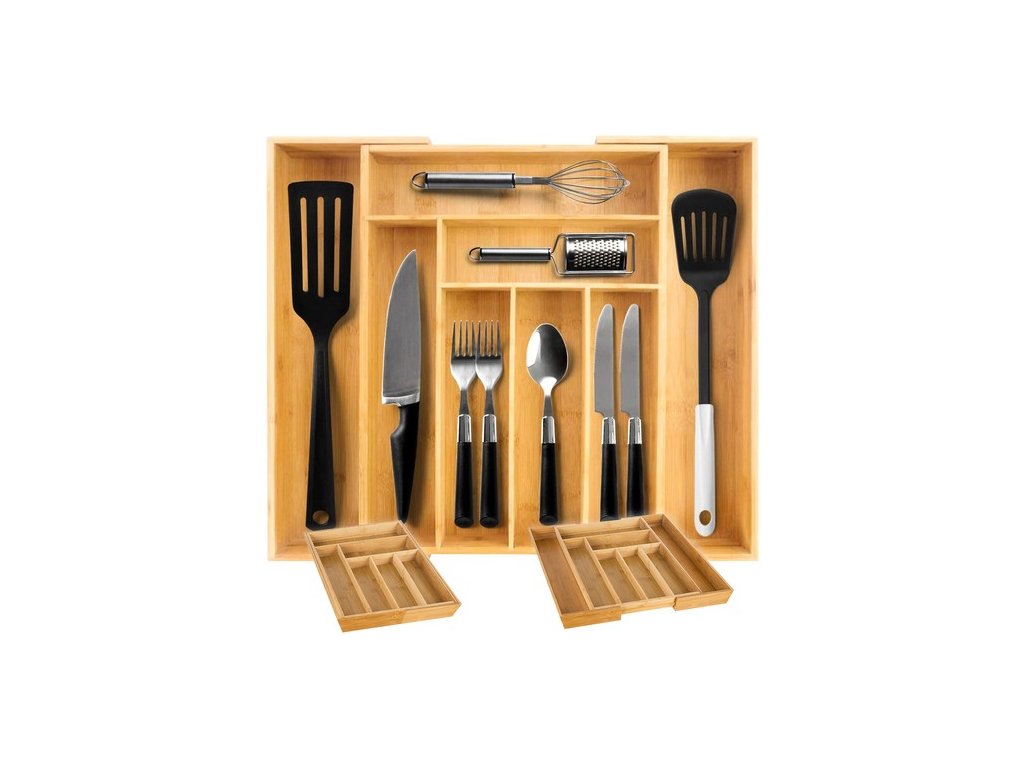 - ROZŠÍŘITELNÉ – chcete mít v organizéru 6 až 8 přihrádek? Našli jsme pro vás dokonalé řešení. Jedná se o výsuvný organizér do zásuvky. Nejmenší verze má 6 přihrádek a v rozloženém stavu jich má až 8. Díky tomu se nemusíte bát místa pro další příbory, jako jsou malé vidličky nebo přídavné nože.