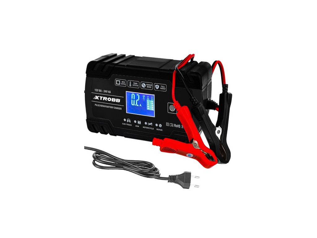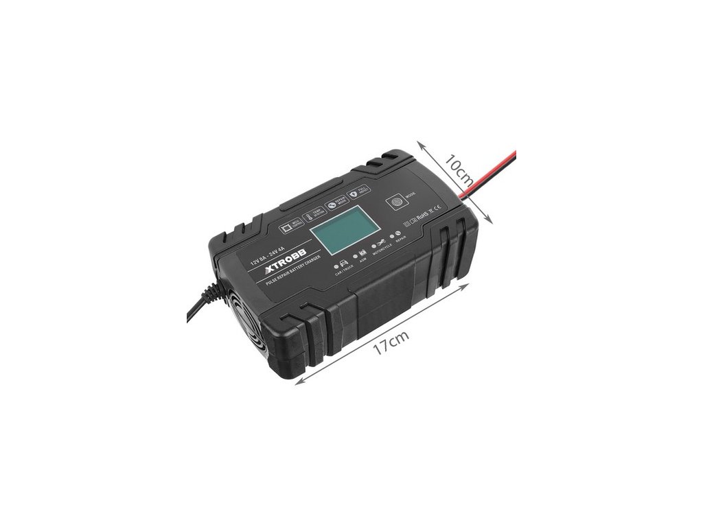 - SPECIFIKACE - barva: černá; materiál: ABS, ostatní: PVC + PC + PP + železo; vstupní napětí: 100-240V; jmenovitý výkon: 12V/8A, 24V/4A; rozsah baterie: 6-150 Ah; výkon: 130 W; tepelná ochrana: 65°C +/- 5°C; minimální startovací napětí: 2,0V; délka kabelu s koncovkami (černá a červená): 63cm; délka přívodního kabelu 107cm; rozměry (délka/šířka): 17/10 cm; hmotnost: 0,70 kg.