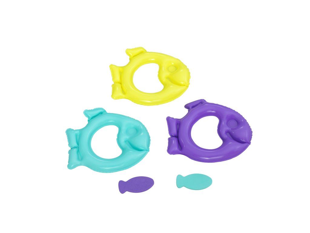 Sada obsahuje nafukovacího tuleně, 2 pěnové ryby na krmení, 3 barevné kruhy a opravnou záplatu.