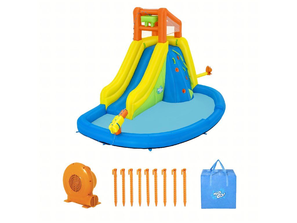 Součástí balení je: skluzavka, dmychadlo, hadice na stříkání vody, kotvící vak, záplaty, taška na skladování a upevňovací kolíky.