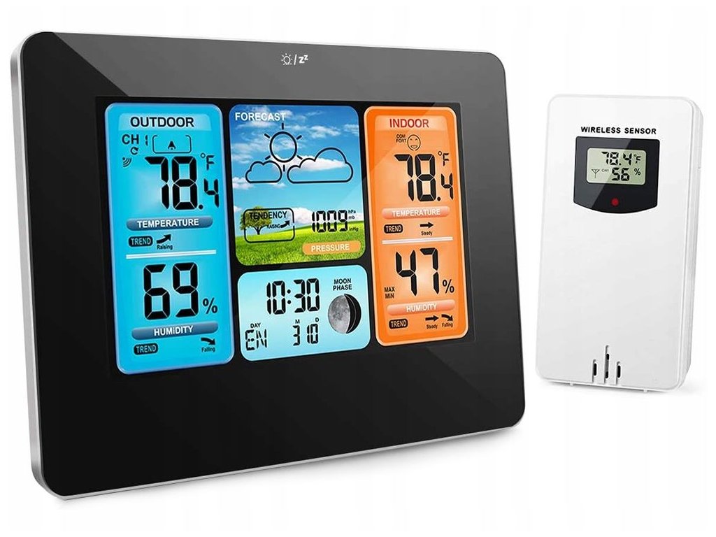 Na výběr je 7 jazyků. Zařízení zobrazuje teplotu a vlhkost venku i uvnitř místnosti. Kromě toho má velký a přehledný LCD displej, ze kterého můžeme snadno vyčíst ukazatele, které nás zajímají. Stanice také zobrazuje fáze měsíce a má funkci předpovědi počasí.