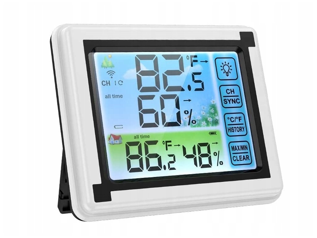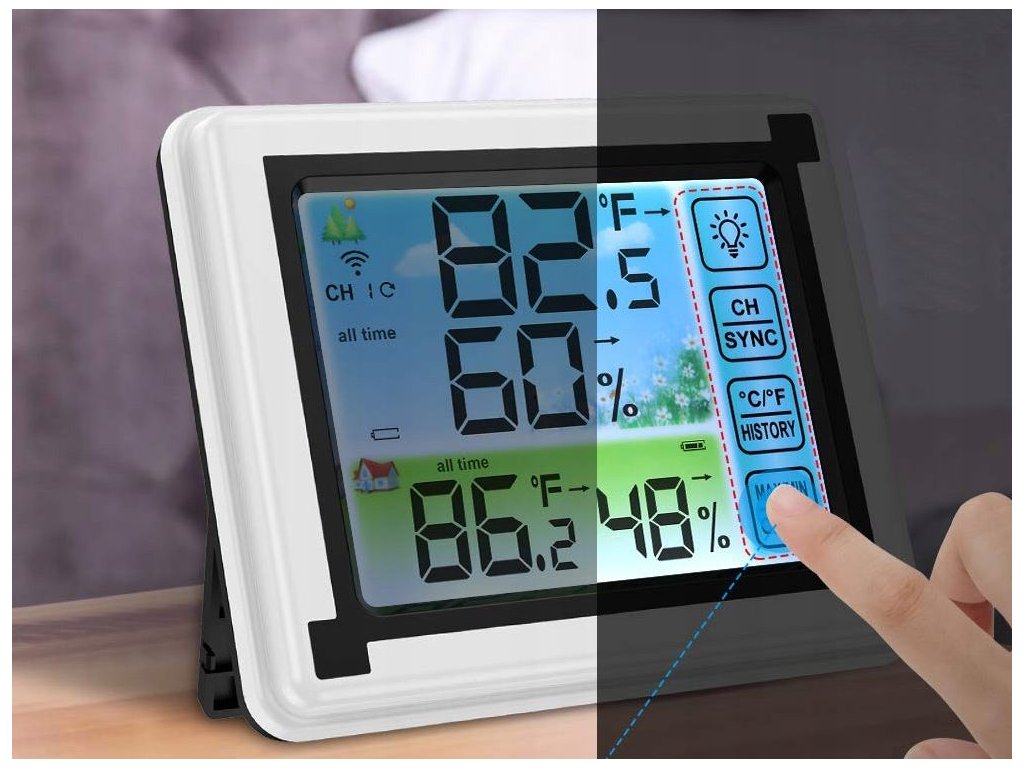 Zařízení zobrazuje teplotu a vlhkost venku i uvnitř místnosti. Navíc má velký, přehledný a dotykový LCD displej , ze kterého snadno vyčteme ukazatele, které nás zajímají. K zařízení lze připojit další senzory. Displej dokáže číst indikátory ze 3 senzorů současně.