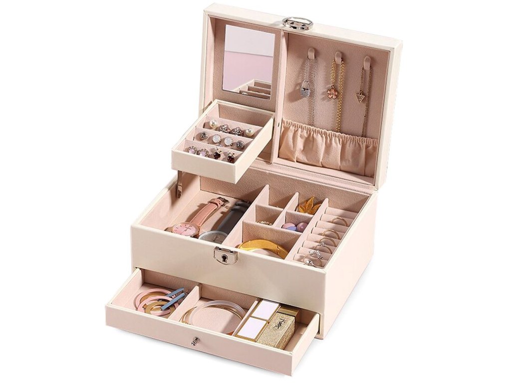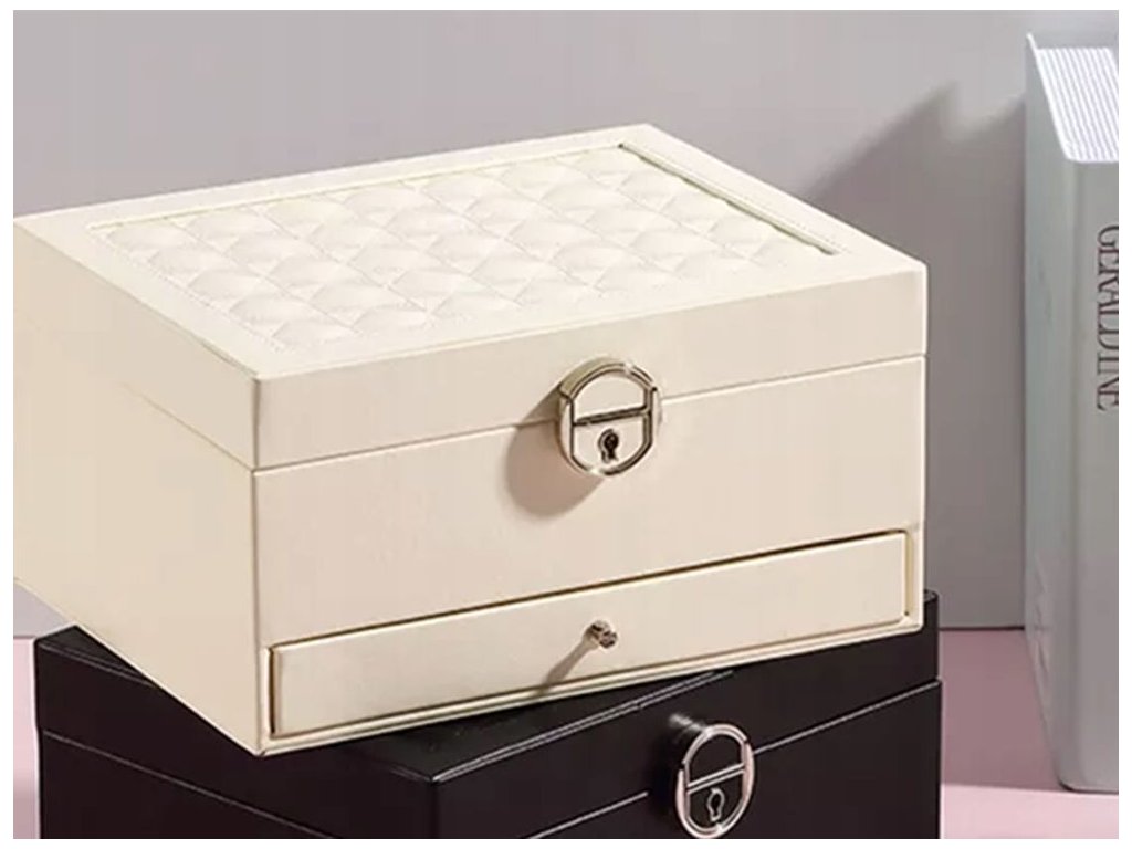Velká, velmi prostorná schránka, která vám umožní uspořádat všechny typy šperků a hodinek. Organizér je vybaven různými typy a velikostmi přihrádek, které úspěšně pojmou velké množství prstenů, řetízků, náušnic, náramků atd.