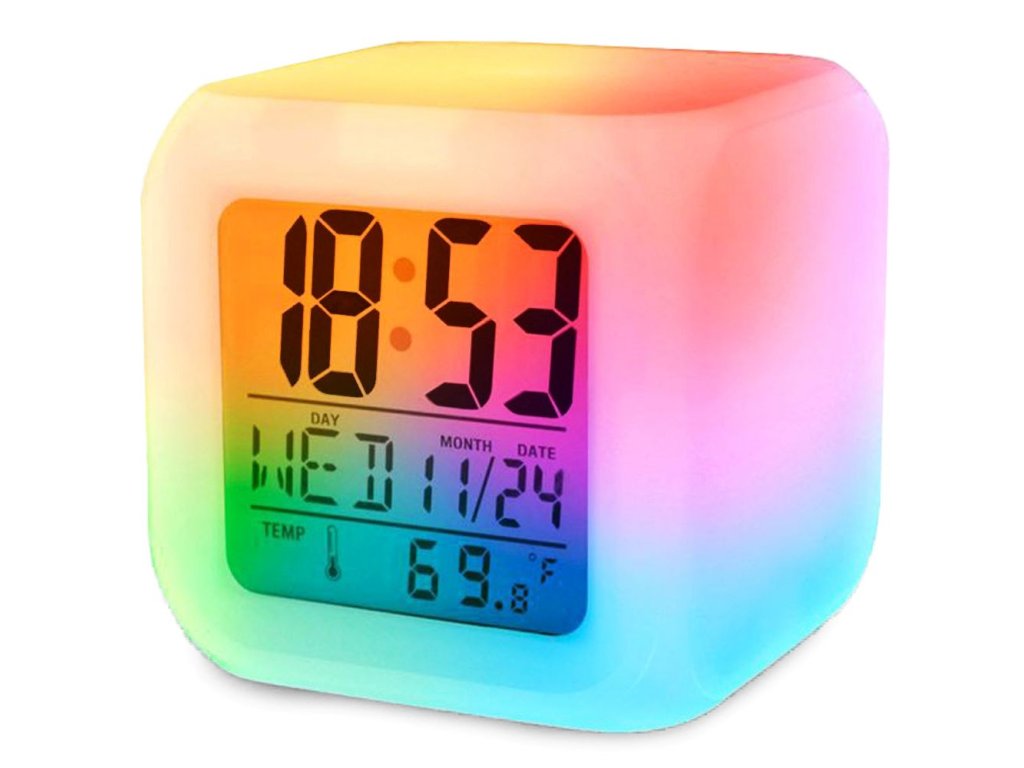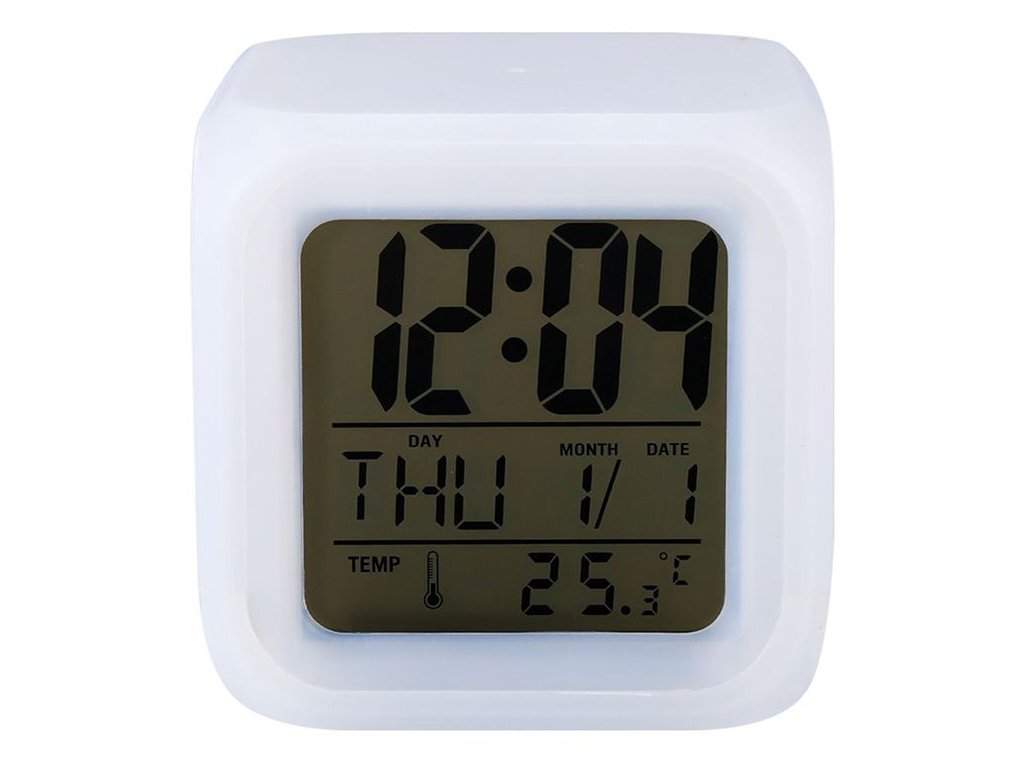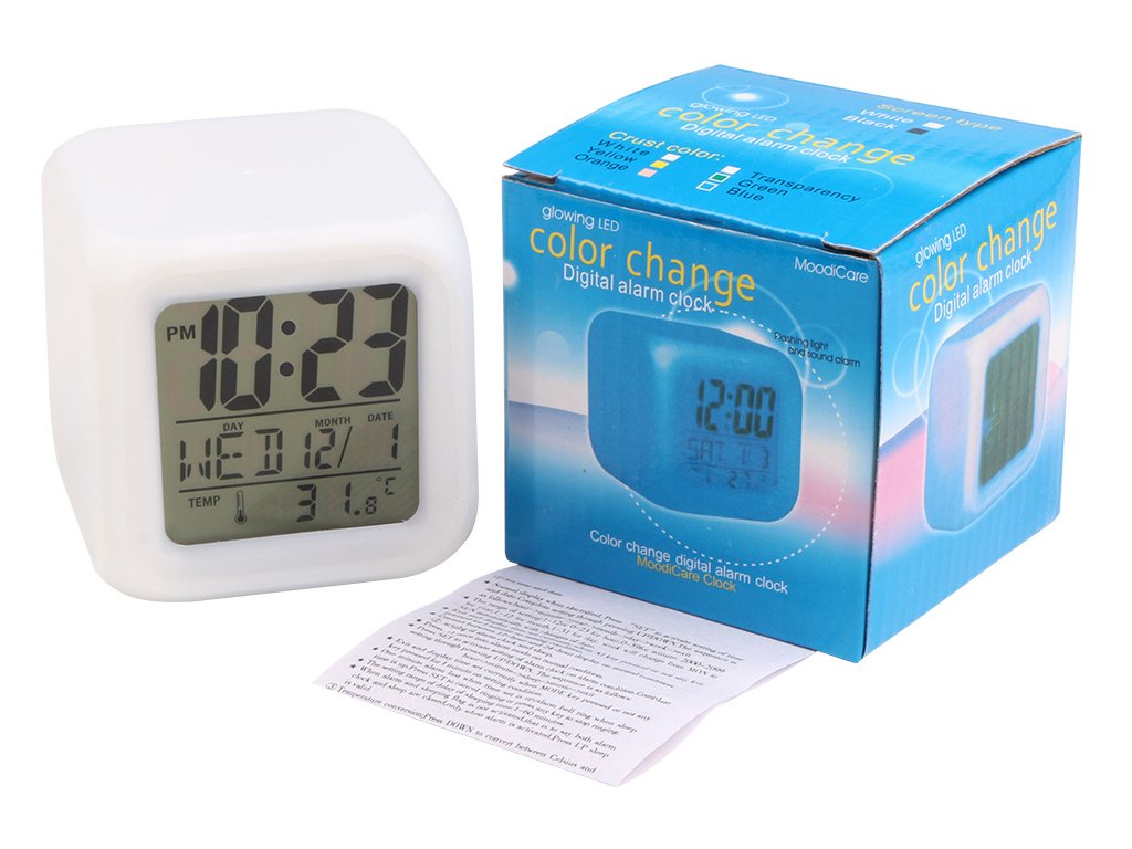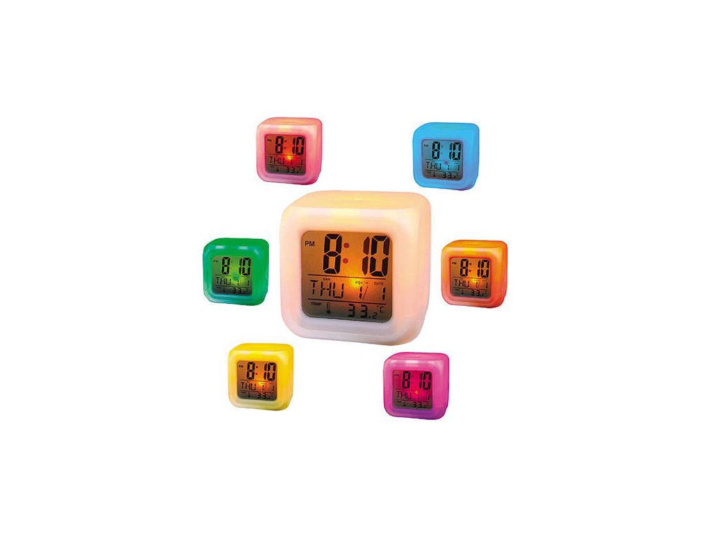 Svítící budík s kalendářem a teploměrem, který plynule mění barvu. Má velký a velmi přehledný LCD displej.