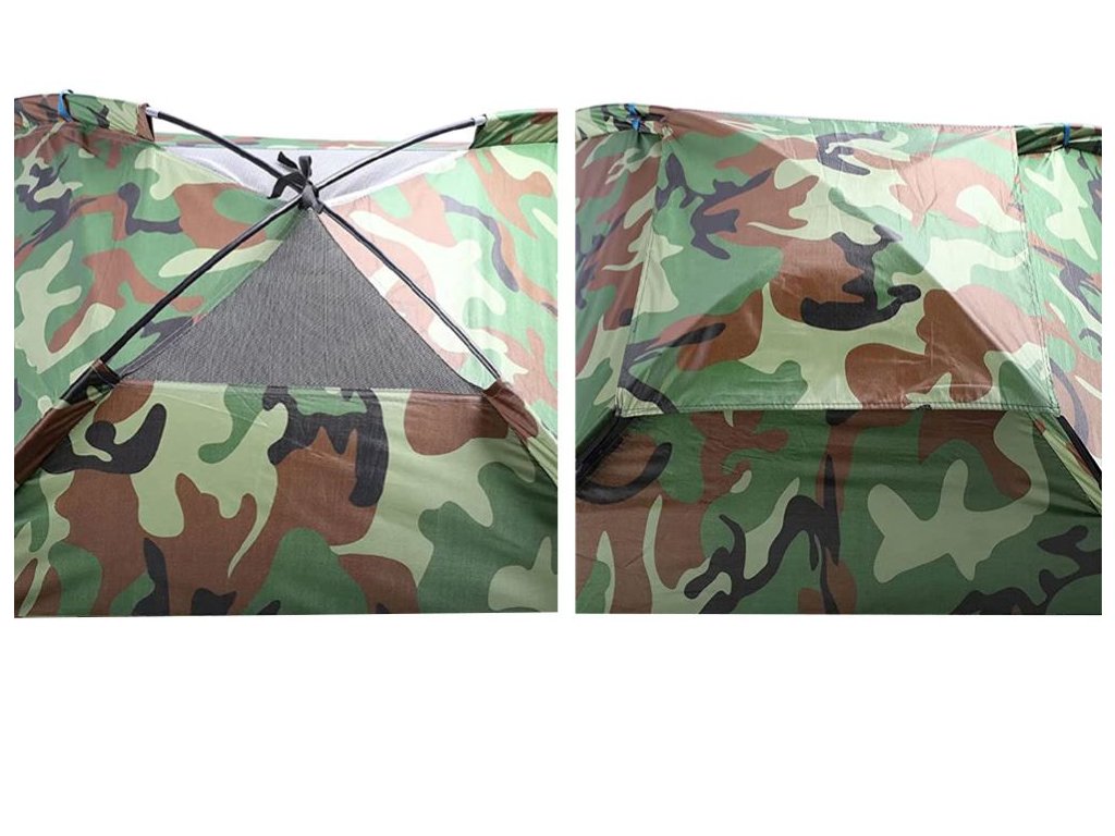 Postavení stanu je velmi jednoduché. Stačí sestavit dva rámové tyče a poté přes ně přetáhnout kryt stanu. Sada obsahuje také kolíky pro připevnění stanu k zemi