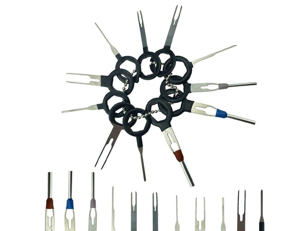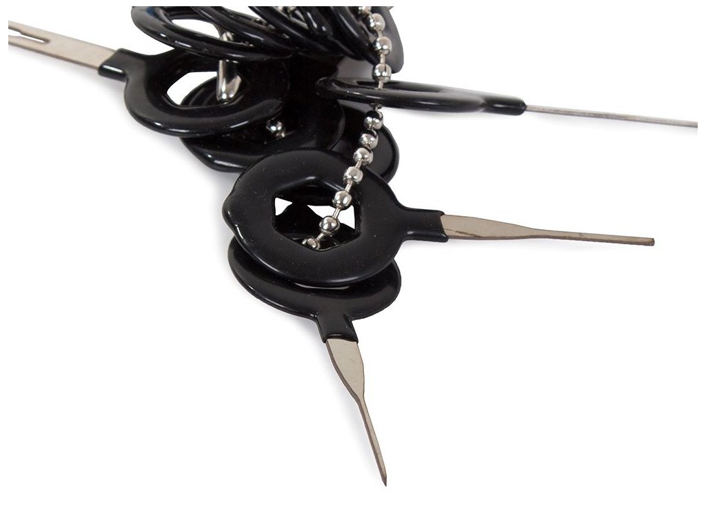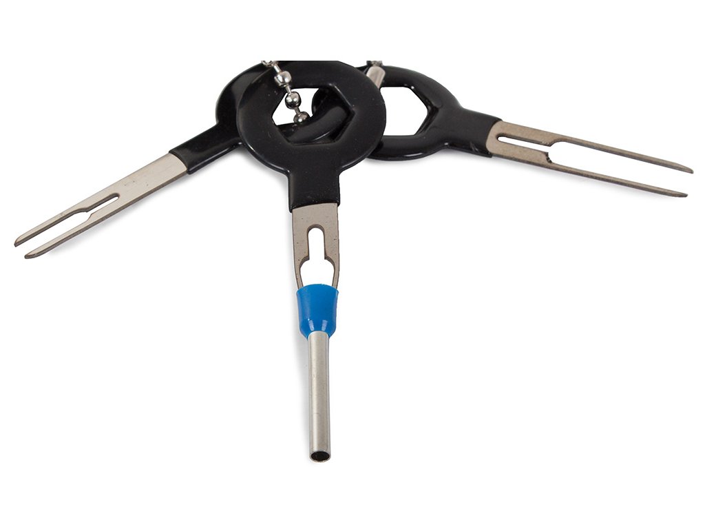 Pomocí vyhazovačů snadno a rychle demontujete kolíky v konektoru nebo zástrčce. Zlomený čep nebo ohnutá deska nebude problém.Sada obsahuje 11 klíčů , z toho 3 trubkové, 4 dvojité a 4 jednoduché . Vše zavěšeno na řetízku , abyste v případě potřeby našli správný konec. Použití kláves je velmi jednoduché. Stačí sejmout ochranu konektoru, odpojit zástrčku, vybrat klíč vhodné velikosti, jemně jej zatlačit do zvolené zásuvky a poté, držet vytahovač stlačený, jemně vytáhnout kabel.