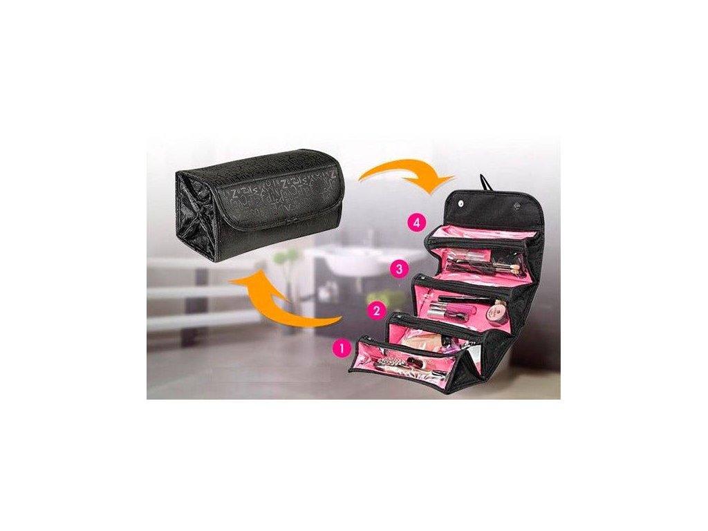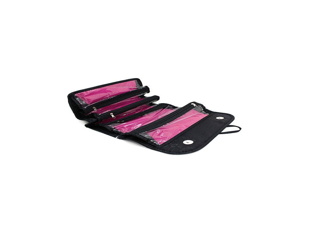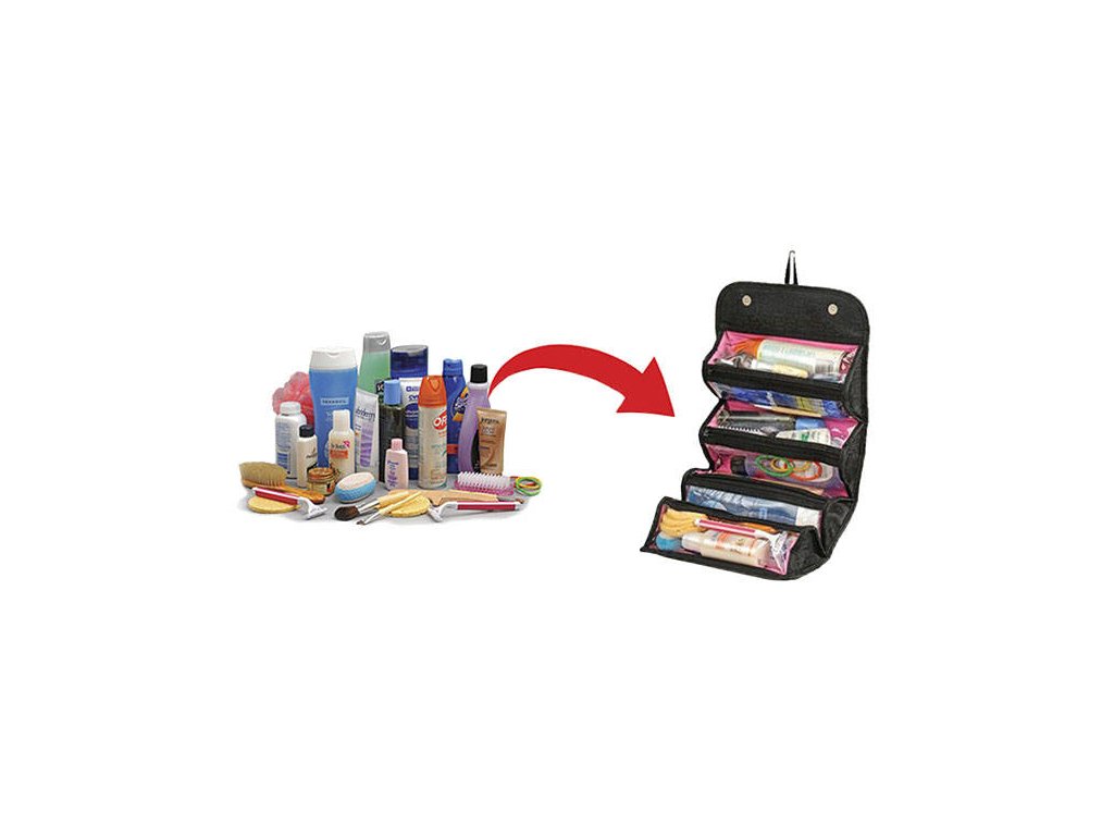 Kosmetická taštička má navíc ucho, díky kterému lze rozloženou kosmetickou taštičku zavěsit na háček v koupelně nebo na dveře .