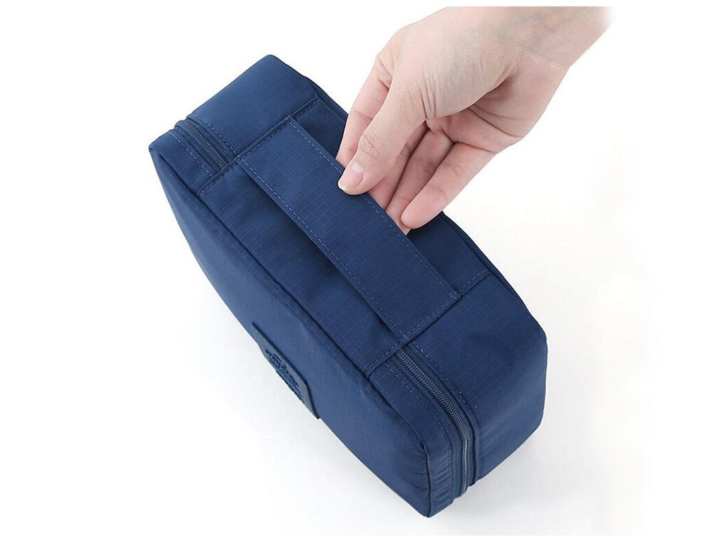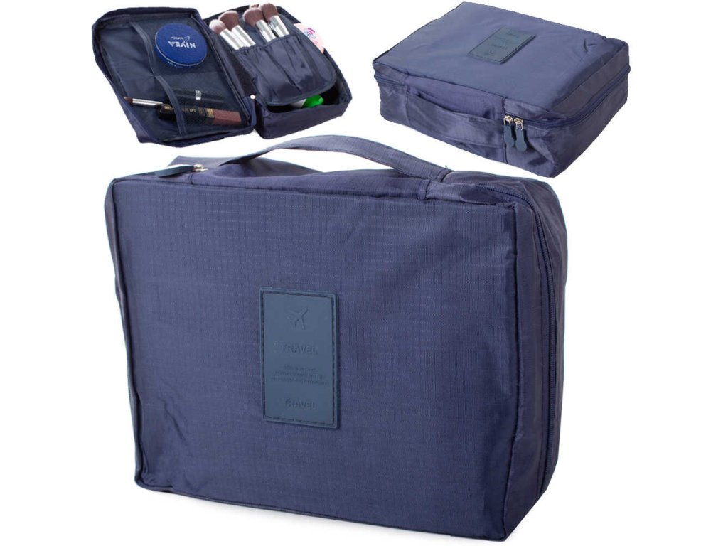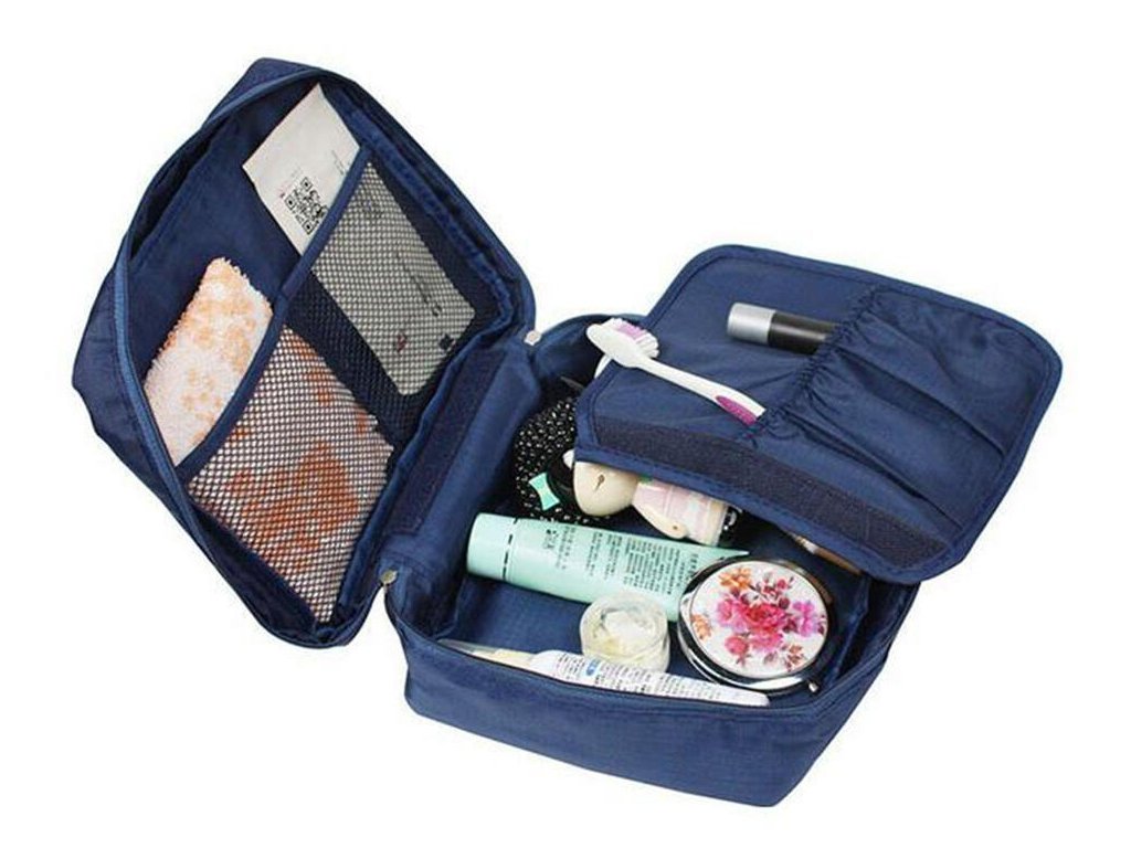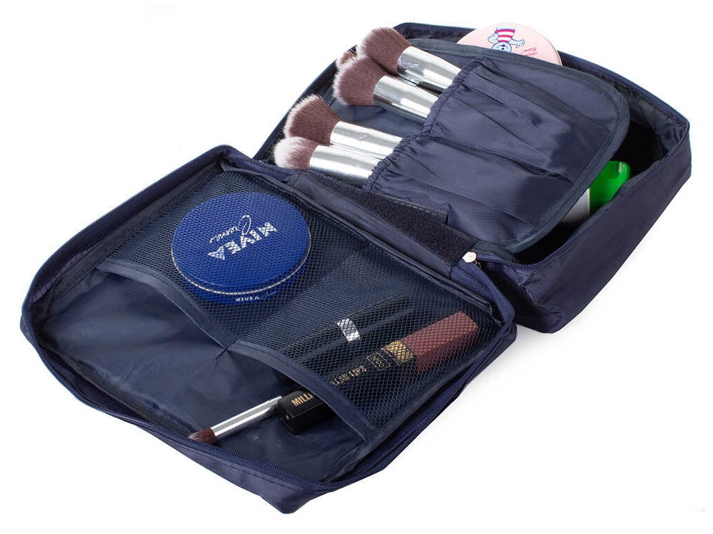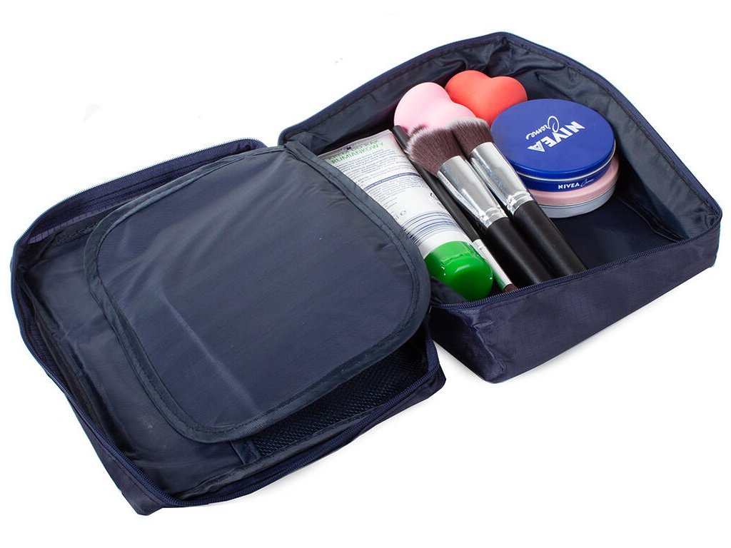 Organizér je velmi prostorný, má jednu přihrádku , jednu přihrádku se dvěma kapsami , připevňuje se suchým zipem , můžete jej odepnout a dodatečně zvětšit kapacitu kosmetické taštičky . Má také 2 kapsy na menší předměty. Ve složeném stavu zabírá velmi málo místa.