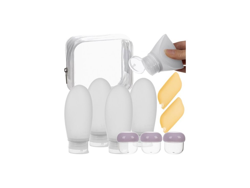 Sada obsahuje 10 prvků. Těsné nádoby pojmou veškerou potřebnou kosmetiku vložíte do průhledné kosmetické taštičky.