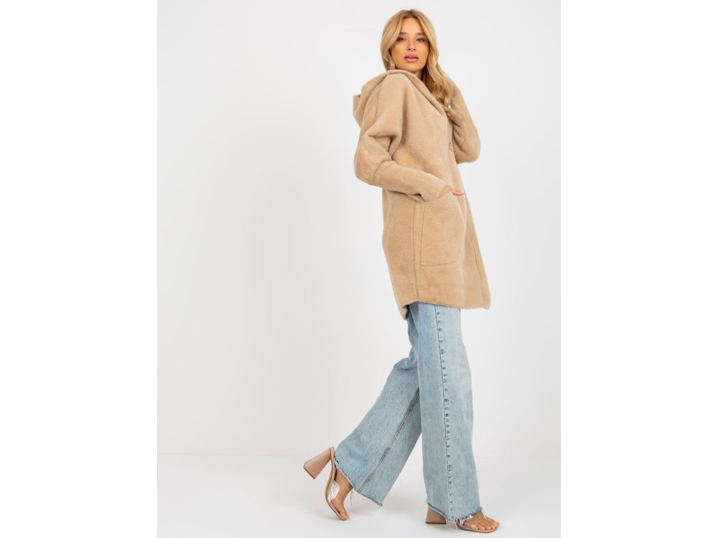 Dámský kabát z alpaky v barvě camel s kapucí a zipem