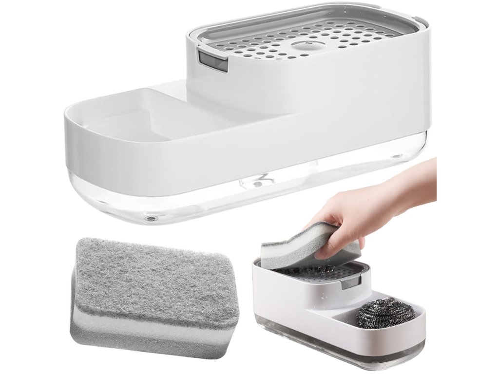 ✅ Dávkovač na tekutý prostředek na nádobí s houbičkou – pohodlí a pořádek u dřezu