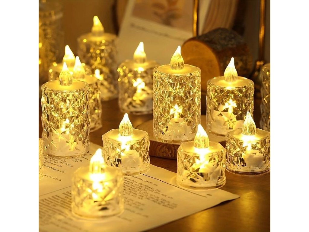 Vytvořte kouzelnou atmosféru s těmito křišťálovými LED bezplamennými svíčkami, které kombinují elegantní design s bezpečností a praktičností. Každá svíčka má jemný krystalový vzor a teplé bílé světlo, které dokonale napodobuje skutečný plamen – bez kouře, zápachu a rizika požáru.
