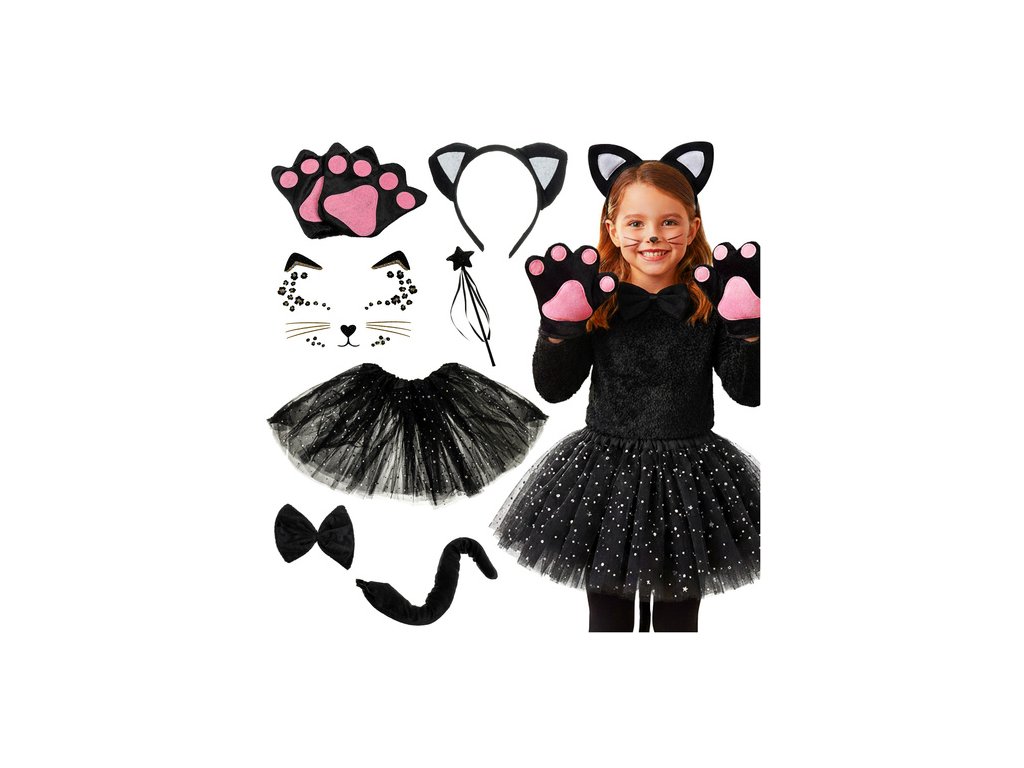 - kompletní sada - kostým se skládá až ze 7 prvky : sukně, samolepky na obličej, čelenka, hůlka, kočičí tlapky, ocas a motýlek – vše, co potřebujete k vytvoření kompletního stylingu