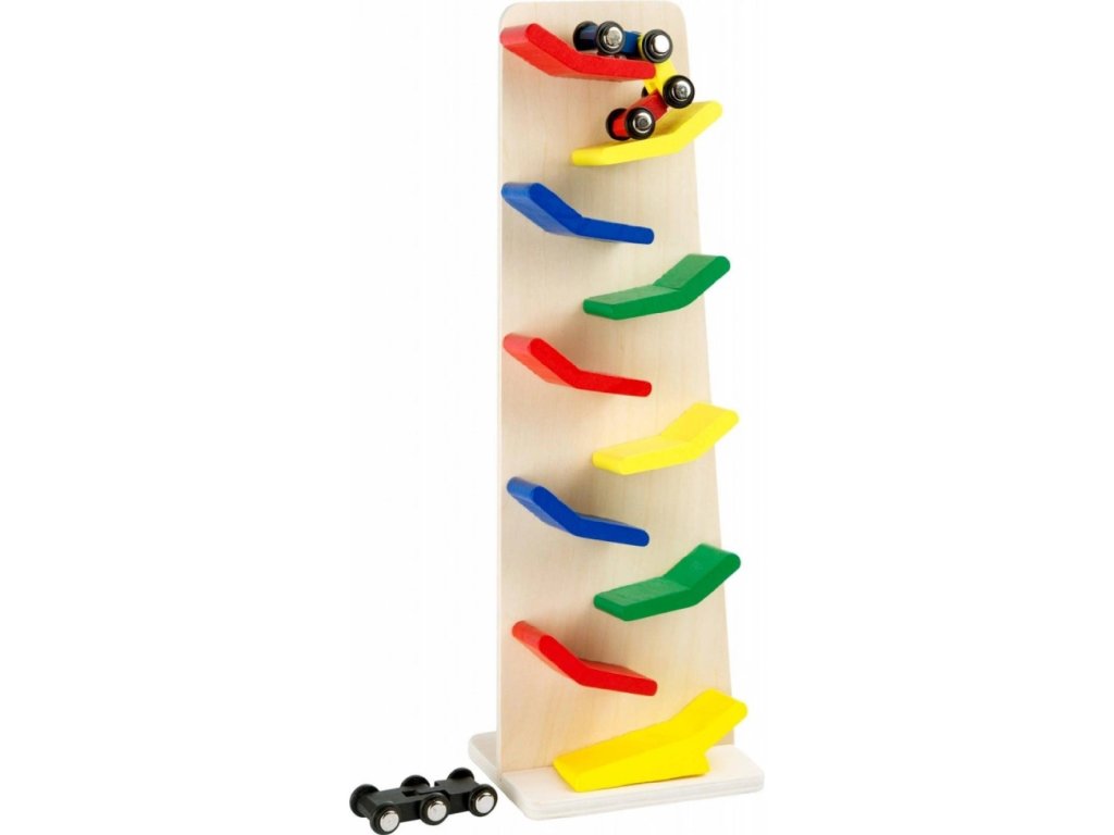 Zábavná dřevěná hračka s autíčky, které sviští po barevné dráze dolů, je skvělým způsobem, jak děti zabavit a zároveň rozvíjet jejich motoriku, pozorovací schopnosti a logické myšlení. Stačí položit autíčko na vrchol a sledovat, jak sjíždí po barevných rampách až dolů. Kvalitní dřevěné provedení a veselý barevný design zaručují dlouhou životnost i radost ze hry.