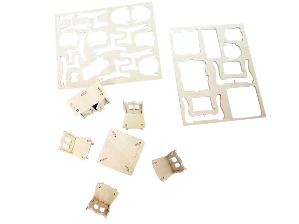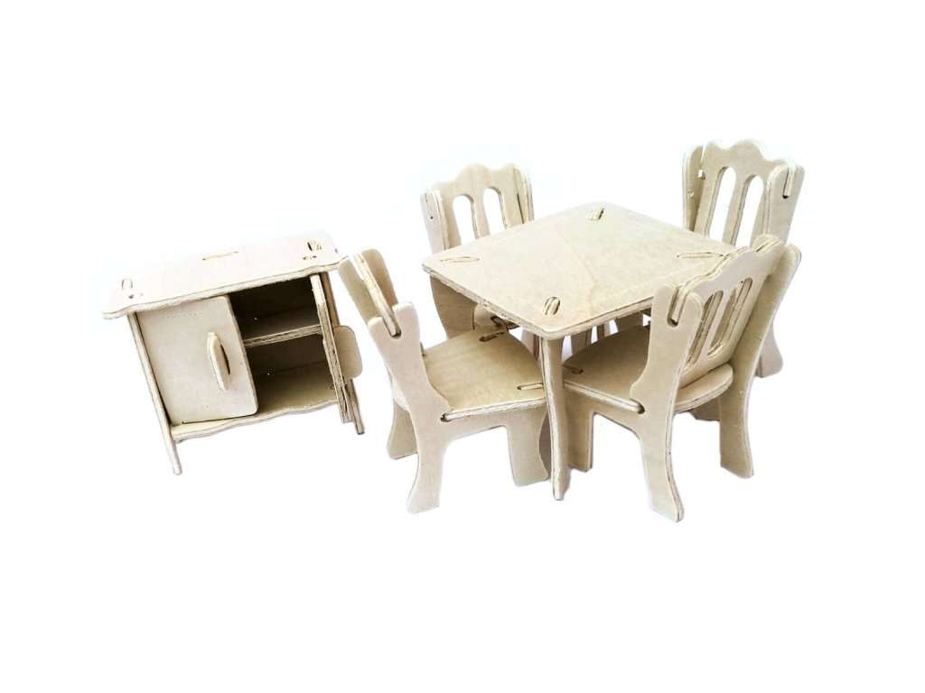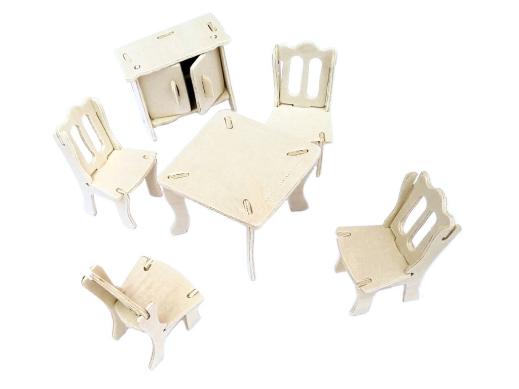Tento set dřevěného nábytku je skvělým doplňkem pro každý domeček pro panenky. Vyroben z kvalitní překližky, je dodáván jako stavebnice ve dvou deskách s přesně vyřezanými díly, které stačí jednoduše vyloupnout a sestavit bez použití lepidla.