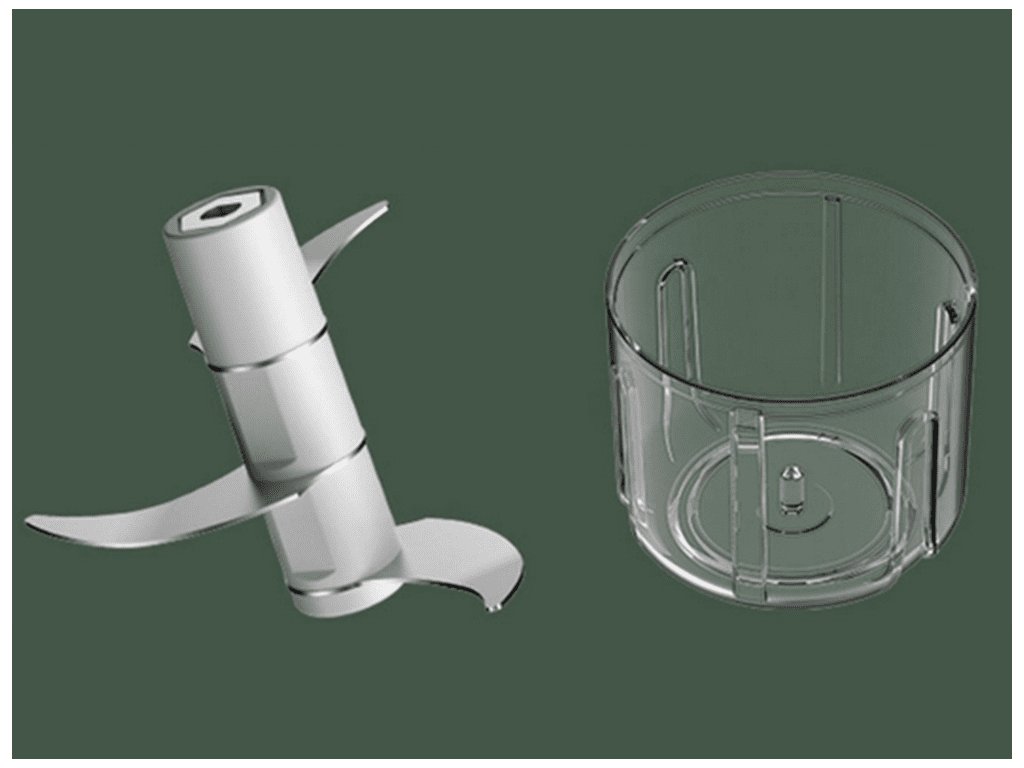Zařízení je vybaveno nádobou o objemu 250 ml a třemi čepelemi z nerezové oceli.