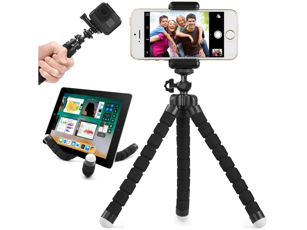 Stativ má univerzální závit pro fotoaparáty a videokamery a držák na telefon.