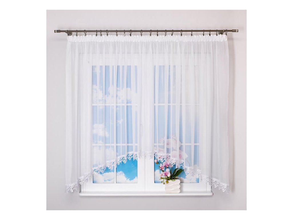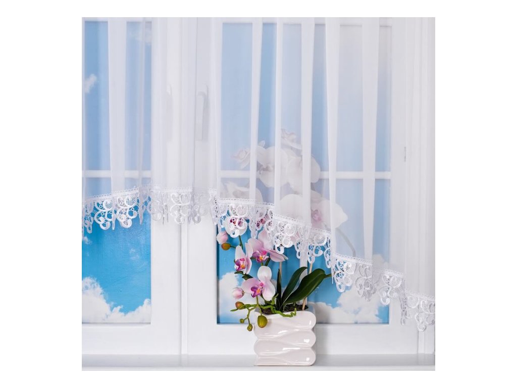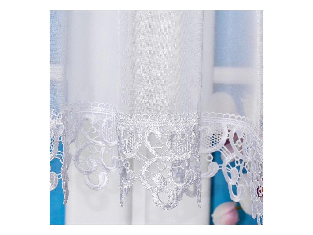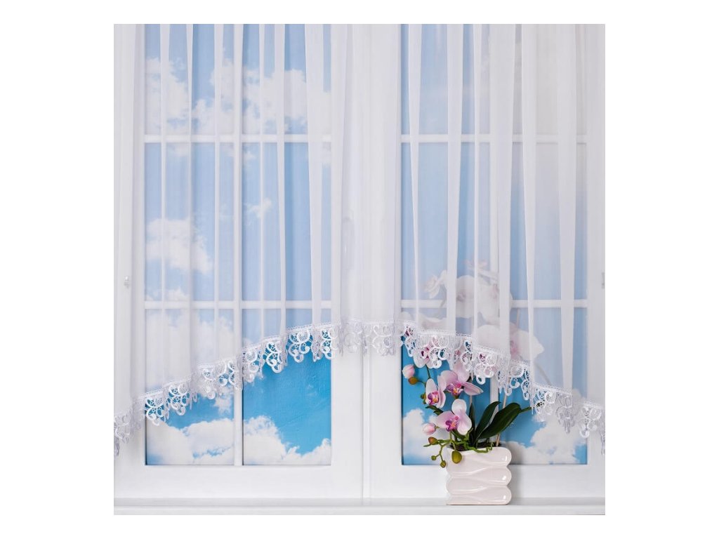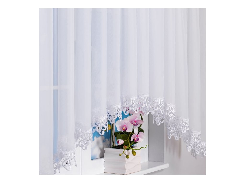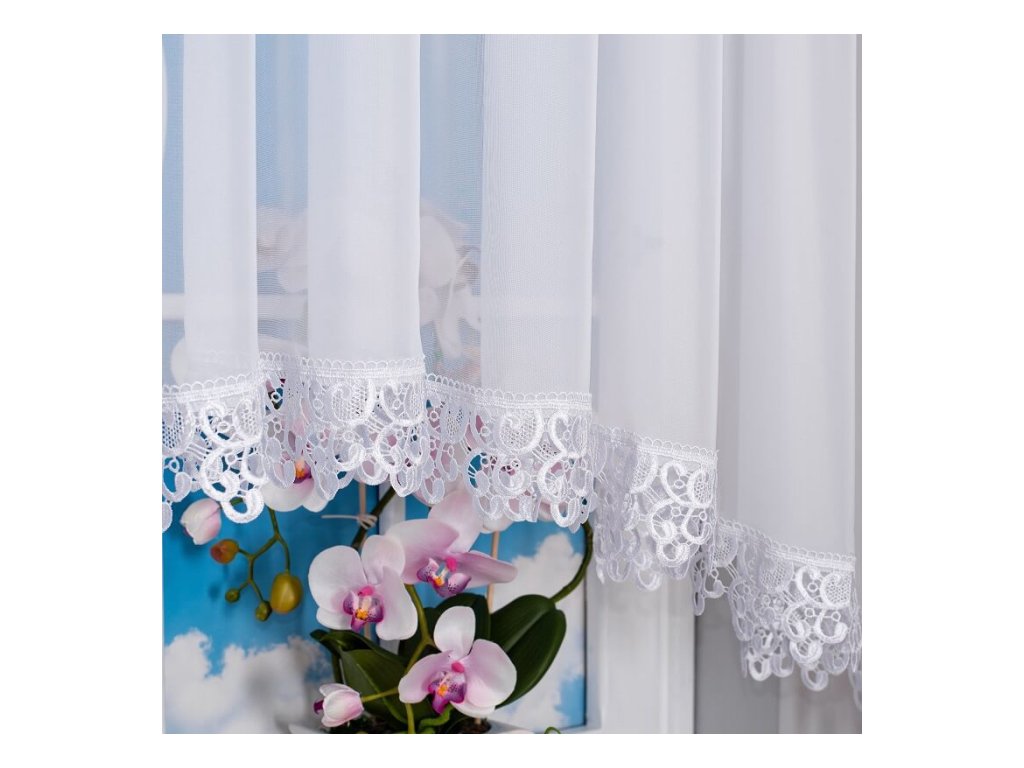 Záclona je vyrobena z kvalitního, mléčně průsvitného voálu, který propouští dostatek denního světla, ale zároveň zajišťuje příjemné soukromí. Elegantní gipurové zakončení dodává jemný dekorativní efekt, který krásně vynikne jak v obývacím pokoji, tak v kuchyni nebo ložnici.