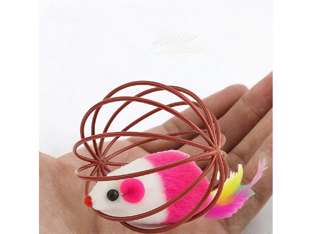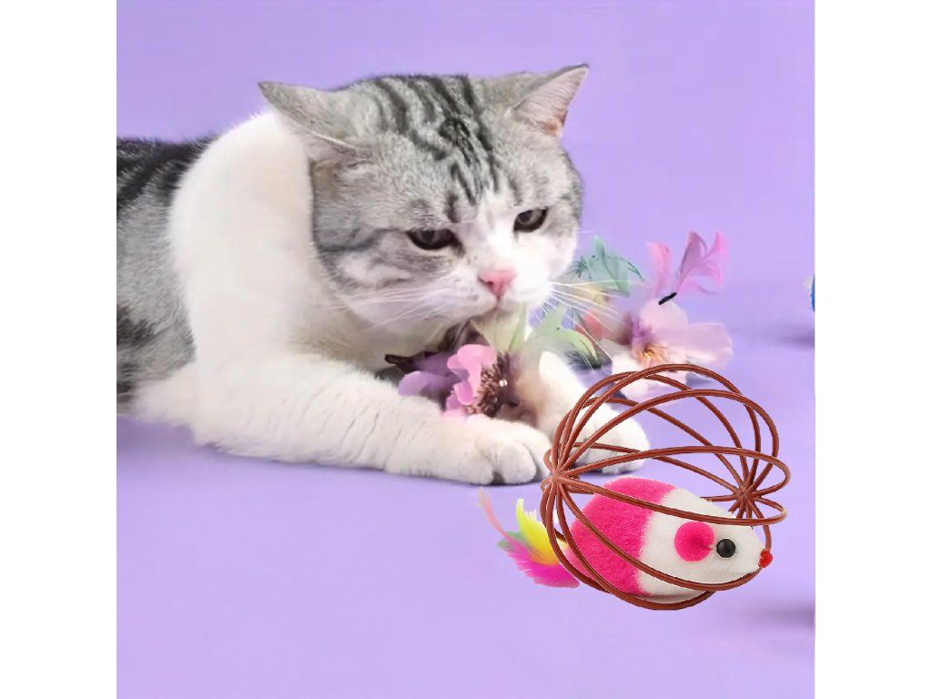 ⬛Hračka pro kočky – interaktivní míček s myškou, peříčky a chrastítkem – drátěná koule⬛