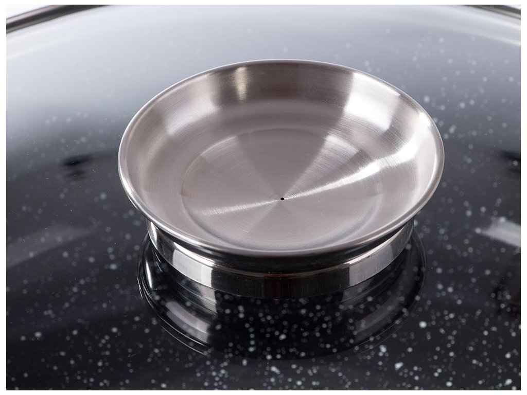 Velká skleněná poklice s ventilem pro uvolňování páry umožňuje kontrolovat tlak a teplotu uvnitř hrnce.