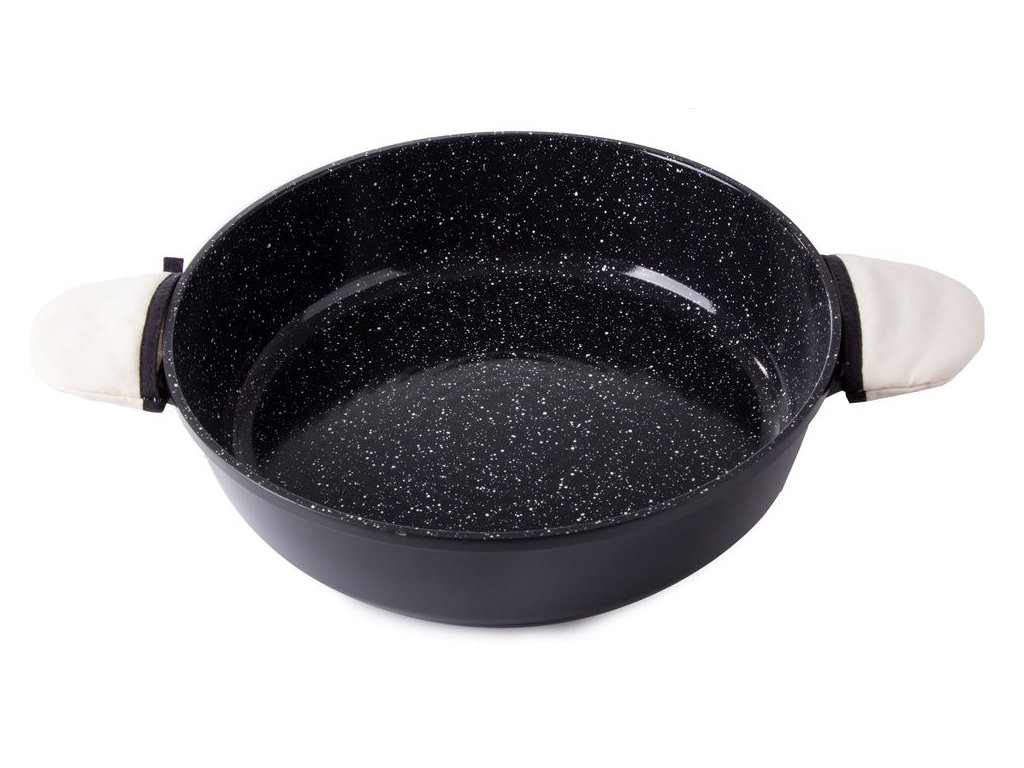 Hrnec je vybaven pevnými rukojeťmi pro pohodlnou manipulaci. Součástí sady jsou navíc žáruvzdorné rukavice (packy). Ty lze snadno a rychle připevnit k rukojeti hrnce, čímž je zajištěno bezpečné držení a stabilita.