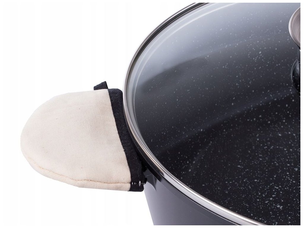 Hrnec je vybaven pevnými rukojeťmi pro pohodlnou manipulaci. Součástí sady jsou navíc žáruvzdorné rukavice (packy). Ty lze snadno a rychle připevnit k rukojeti hrnce, čímž je zajištěno bezpečné držení a stabilita.