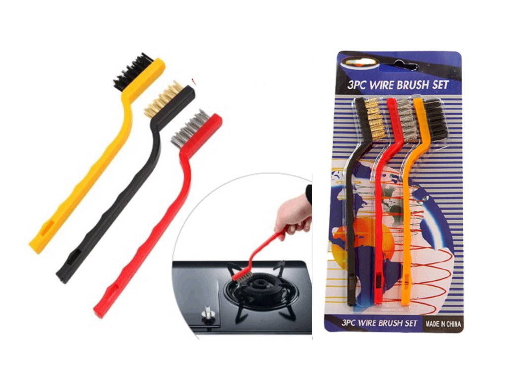 Kartáč s drátěnými štětinami na čištění sporáku a jiných těžko přístupných míst KPL 3 ks 27x9 cm