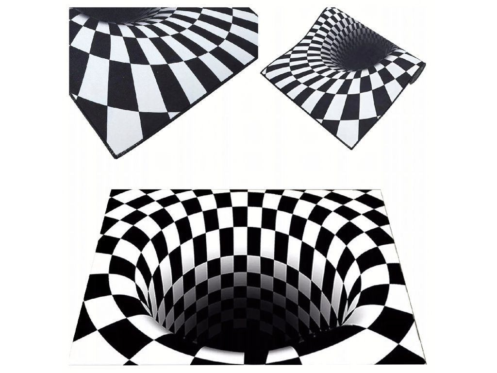 Rohož má geometrický vzor v černobílé barvě, který vytváří iluzi „bílé díry“.