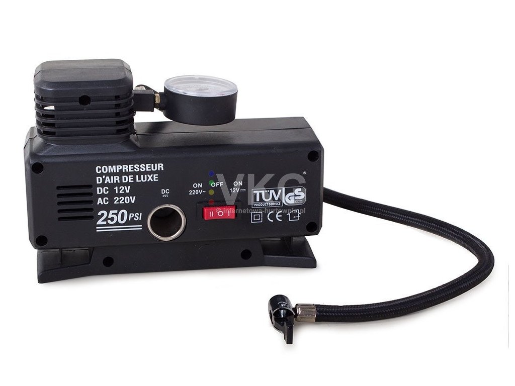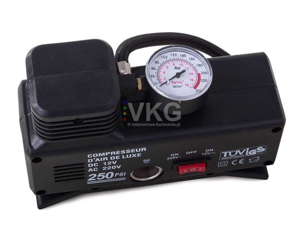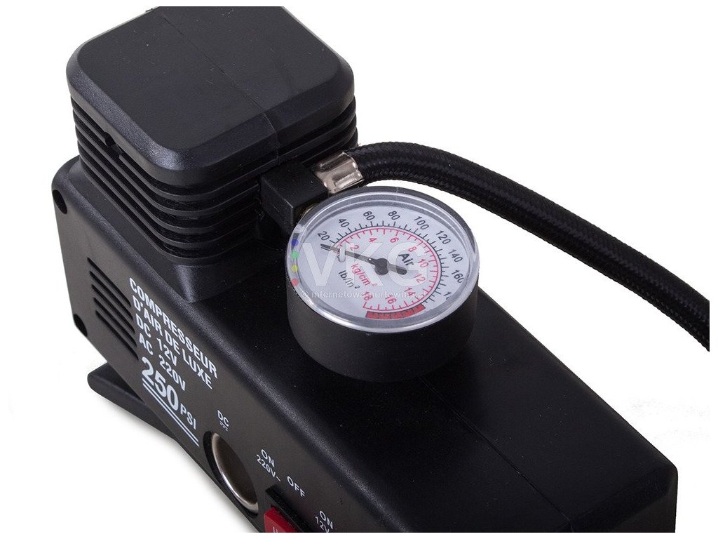 Vysoce kvalitní kompresor napájený ze zásuvky zapalovače cigaret a přes síťový kabel 230 V. Ideální pro pumpování všech druhů předmětů, tj. kol automobilů, kol jízdních kol, míčových matrací atd.