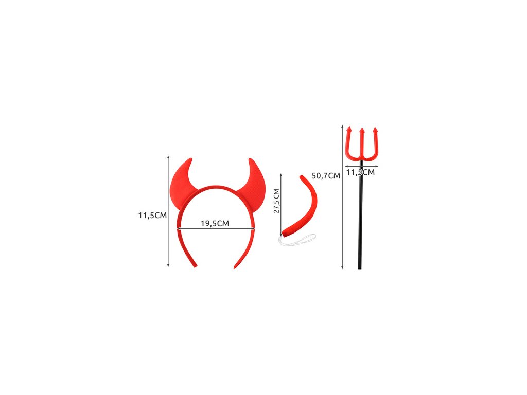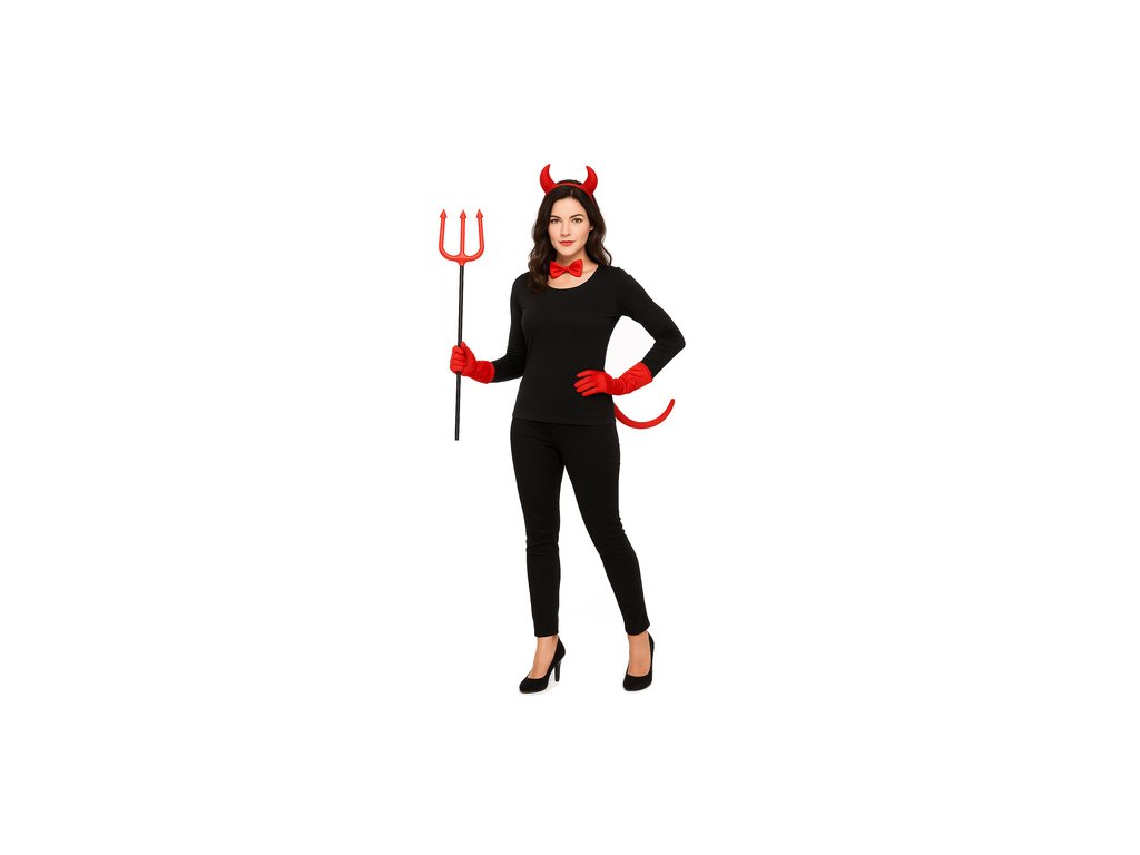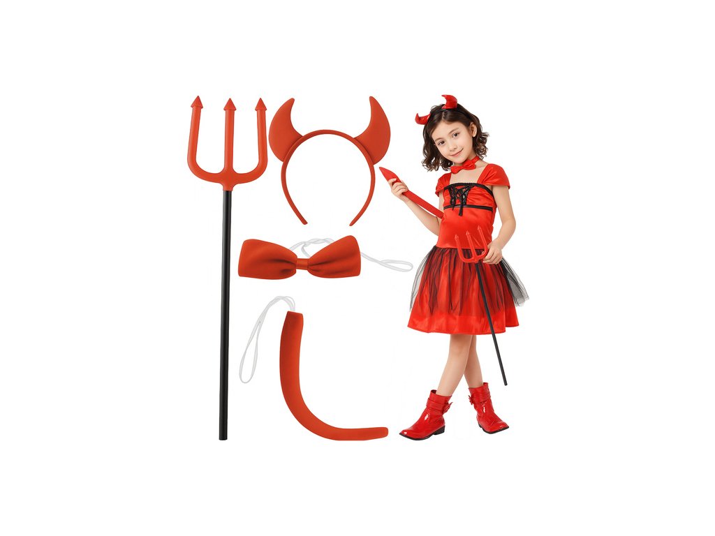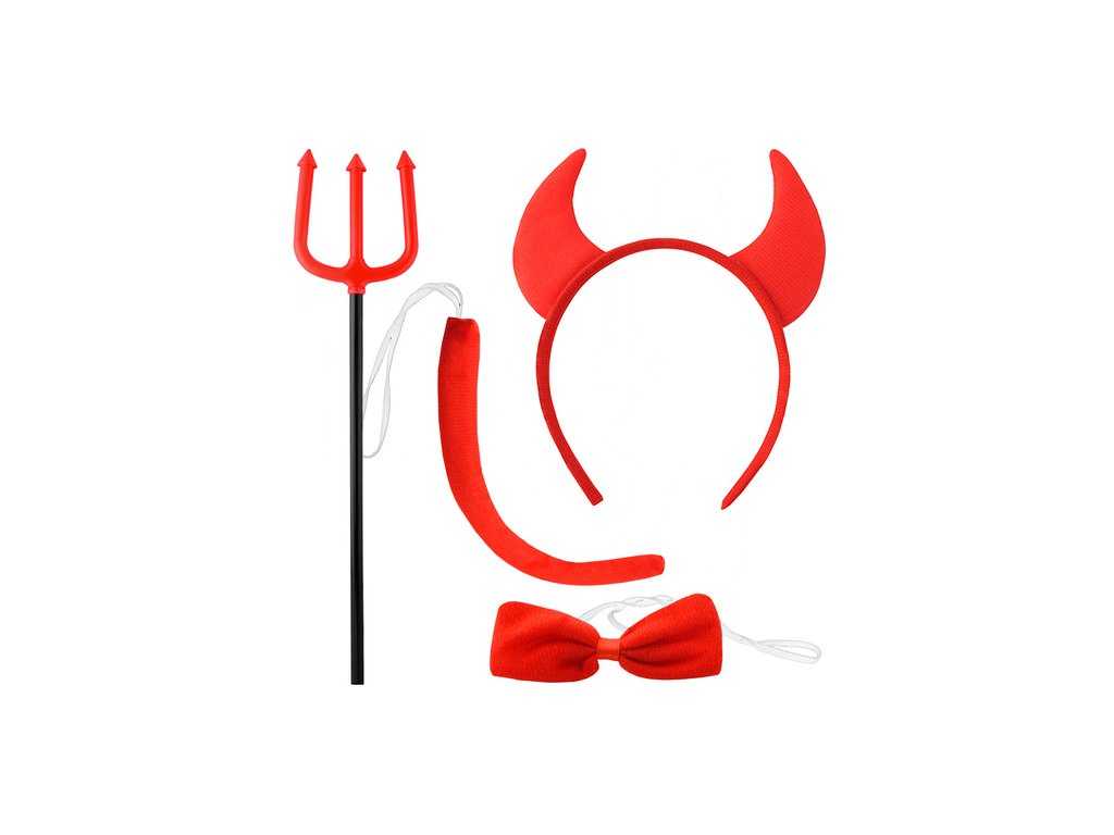 - KOMPLETNÍ KOSTÝM – MALÝ ĎÁBEL – sada se skládá ze 4 částí: vidličky, čelenka s rohy, motýlek a ocas. Kostým je vizuálně atraktivní, má zajímavý vzhled a estetické provedení. Jsou příjemné na dotek. Doplňky vám umožní proměnit se v opravdového ďábla .