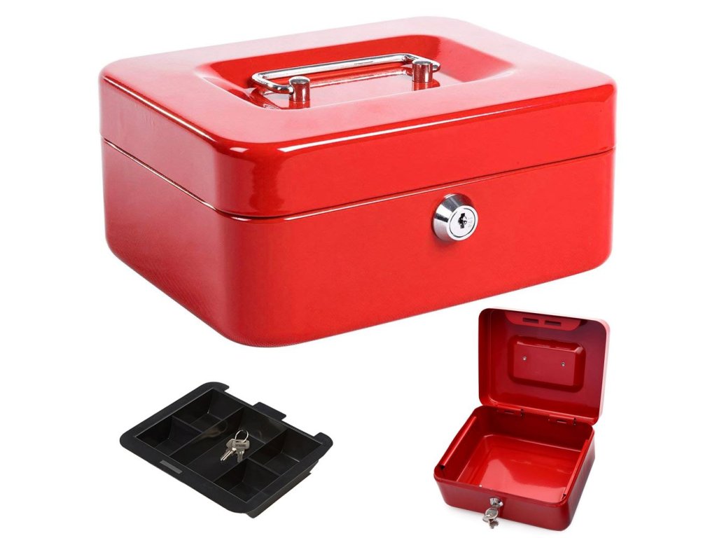 Kovová pokladnička na peníze, trezor na klíč, box na cennosti - červená