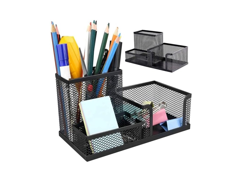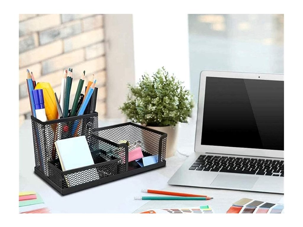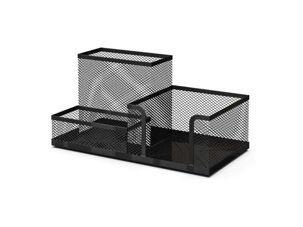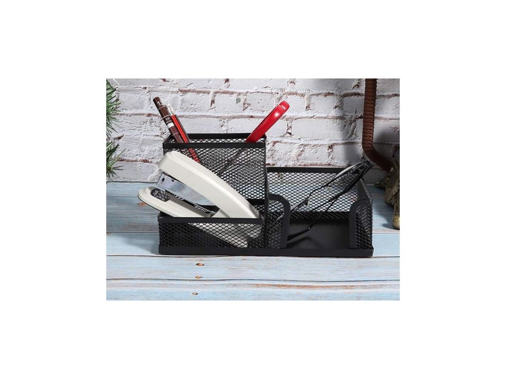 Stolní organizér s lehkou síťovanou kovovou konstrukcí , ideální pro použití doma, v kanceláři atd. Organizér má tři prostorné přihrádky , které vám umožní organizovat všechny druhy kancelářských potřeb. Díky tomu budete mít vše po ruce, což vám umožní soustředit se na práci a zvýšit produktivitu.