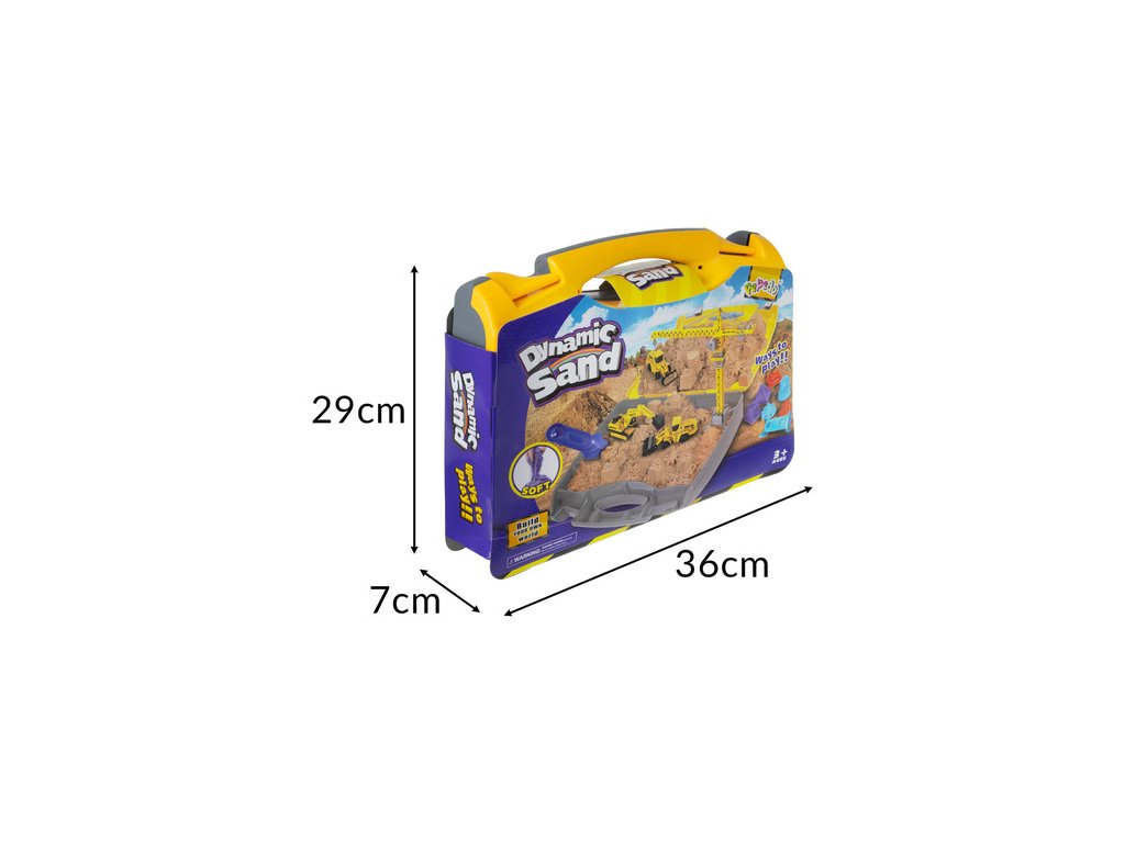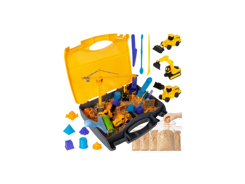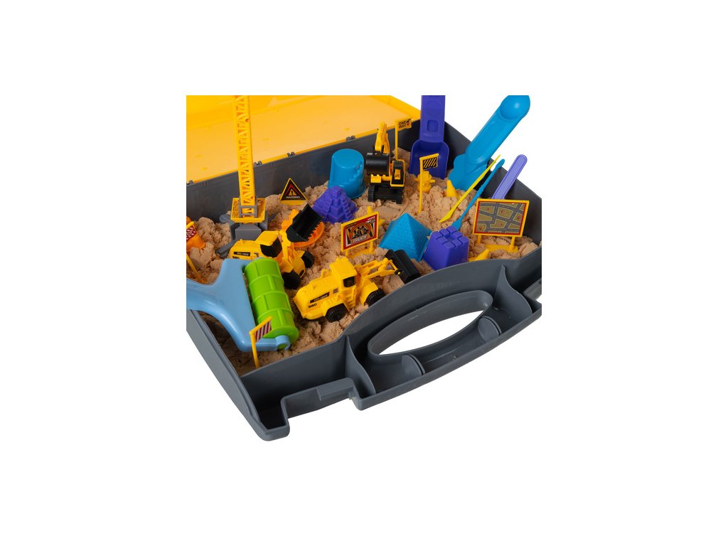 XXL stavebnice s kinetickým pískem – mobilní pískoviště v pouzdře: mobilní jeřáb, stavební vozidla, formičky a příslušenství pro kreativní hru bez nepořádku; senzorický a motorický rozvoj