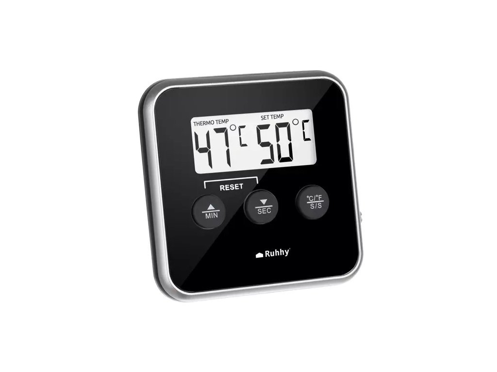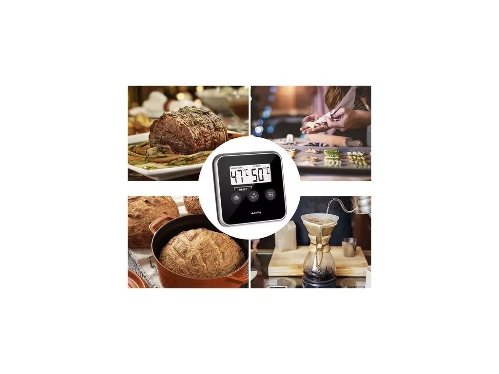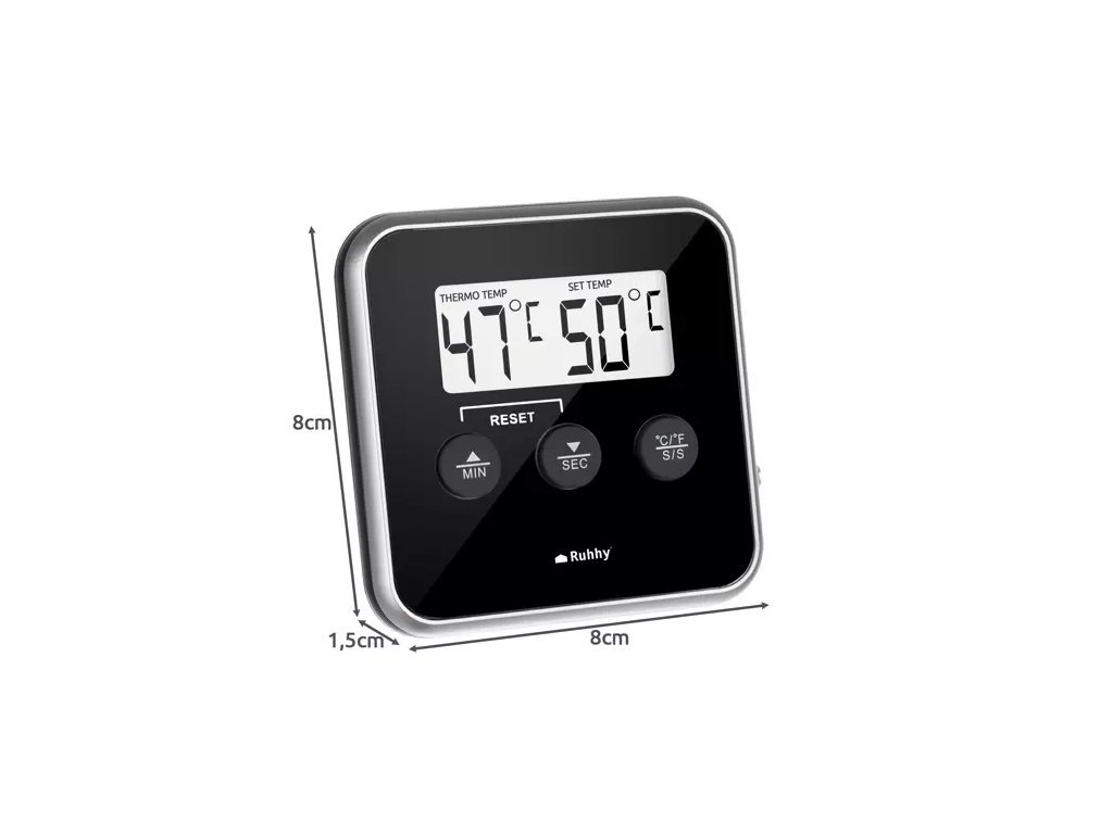 Teploměr má sondu vyrobenou z nejkvalitnější nerezové oceli, vysoce odolné proti poškrábání, promáčknutí a jinému mechanickému poškození, ale i vysokým teplotám. Na krytu teploměru je intuitivní ovládací panel. Zařízení má funkci zamykání - určeno pro nepřetržité sledování teploty a časovač s akustickým signálem. Pracuje v rozsahu od -20 do 250 stupňů Celsia s jednostupňovým přírůstkem. Tepelně odolná sonda z nerezové oceli je umístěna na konci dlouhého a pohodlného kabelu.