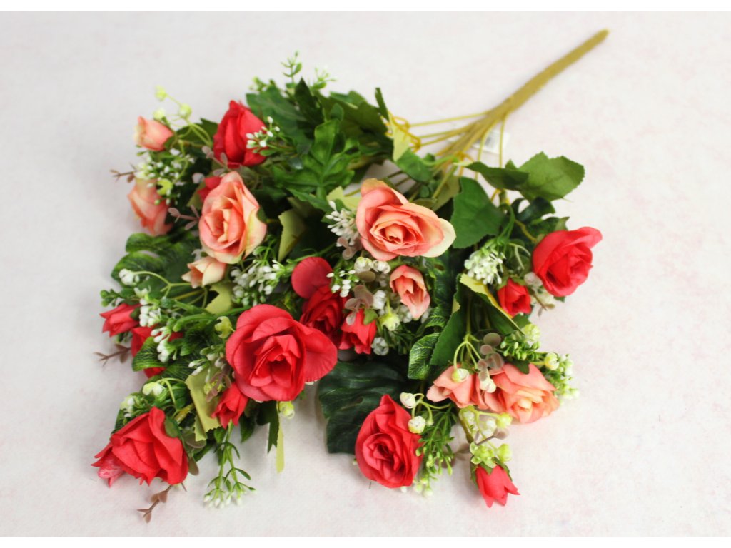 Kytice RŮŽE s doplňky, výška 50 cm, 12 stonků (hlávky 2-4,5 cm) KORALOVÁ