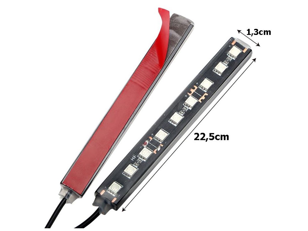 Pásky lze namontovat na různá místa v autě - nad nohy, pod sedadla, do zavazadlového prostoru, pod dveře atd. Snadno se připevňují pomocí oboustranné pásky (je součástí dodávky). Vypínač je umístěn na dálkovém ovladači, který umožňuje ovládat barvu, jas a režim světla. Osvětlení lze také rychle zapnout/vypnout pomocí tlačítka na zástrčce zapalovače cigaret.