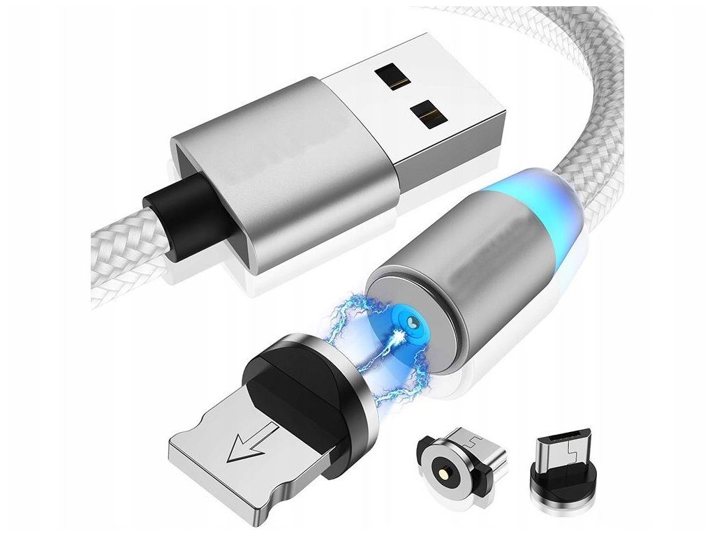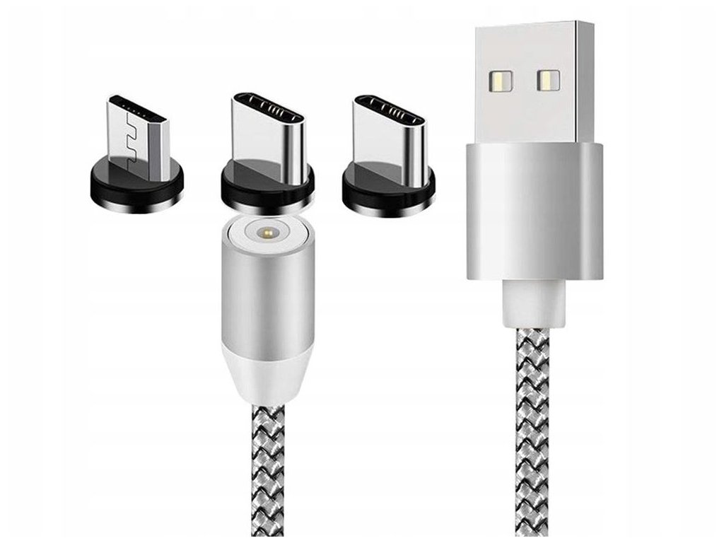 Magnetický nabíjecí kabel 3v1 micro, typ-c, usb, 1m stříbrný
