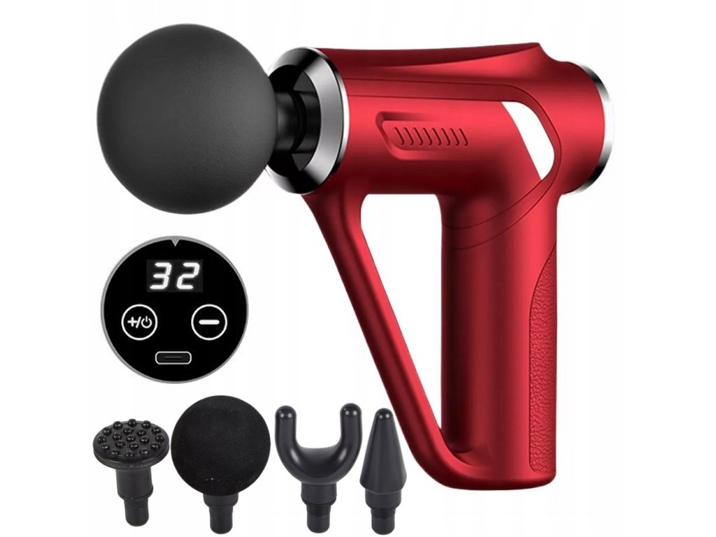 Masážní pistole nejen na záda se 4 nástavci, výkonná, červená