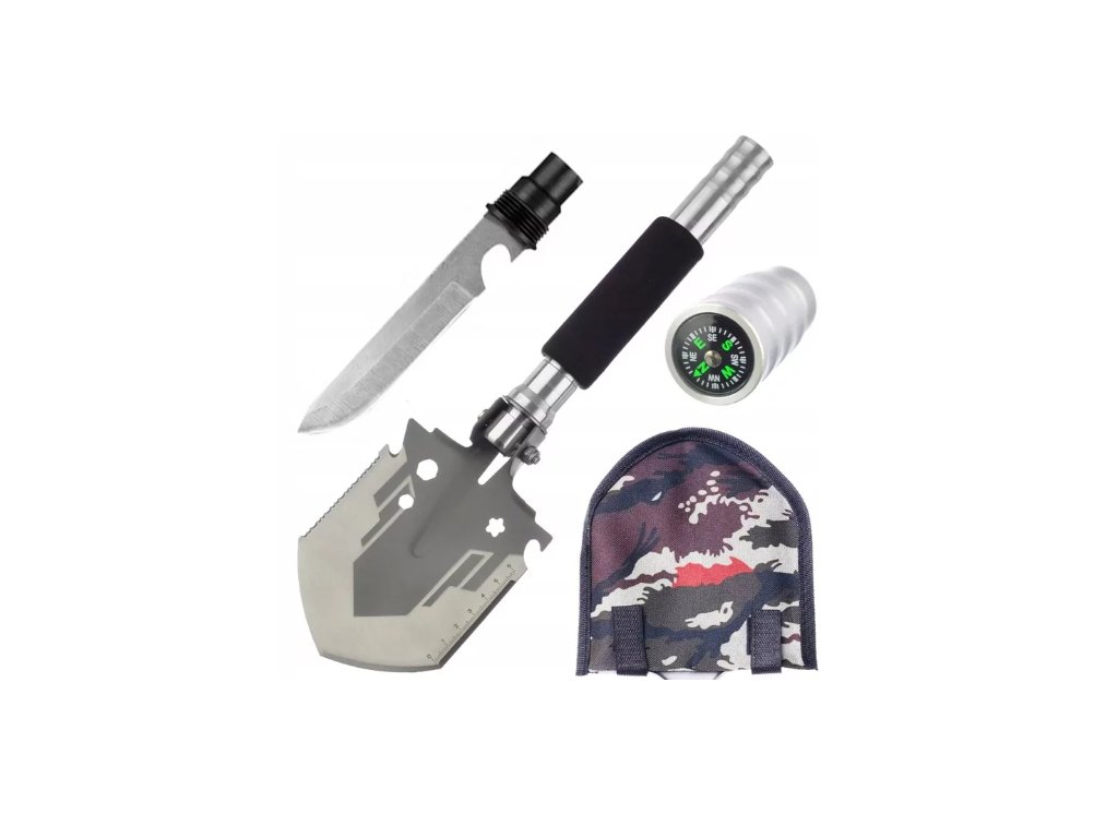 Praktická a kompaktní multifunkční lopatka 8v1 je ideální výbavou pro každého milovníka outdooru, turistiky, kempování i přežití v přírodě. V odolném těle se ukrývá hned několik nástrojů, které vám pomohou v různých situacích – od kopání až po navigaci v terénu.