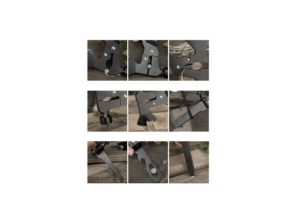 - 17 v 1 - produkt má až 17 různých vestavěných nástrojů, které můžete použít, abyste si poradili při přežití, rybaření, turistice, kempování, ve stanech, v práci nebo jednoduše při zahradničení. Multinářadí obsahuje: sekeru, zajišťovací kleště, pilník, škrabku na ryby, plochý šroubovák, šestihranný klíč, harpunu, otvírák na láhve, pilku na dřevo, křížový šroubovák, kapesní nůž, kladivo, drát řezák, kleště, kleště, dveřní zarážka a zámek.