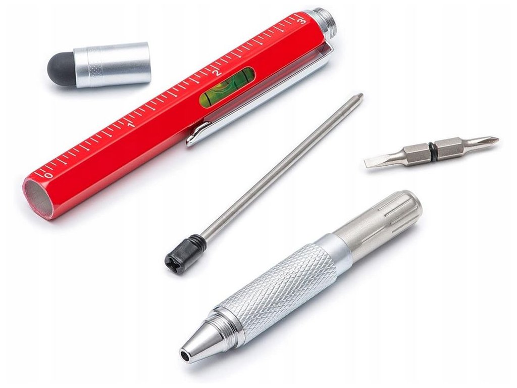 Multifunkční pero obsahuje řadu užitečných nástrojů. Své využití najde v kanceláři, dílně, na stavbě, ve škole apod.