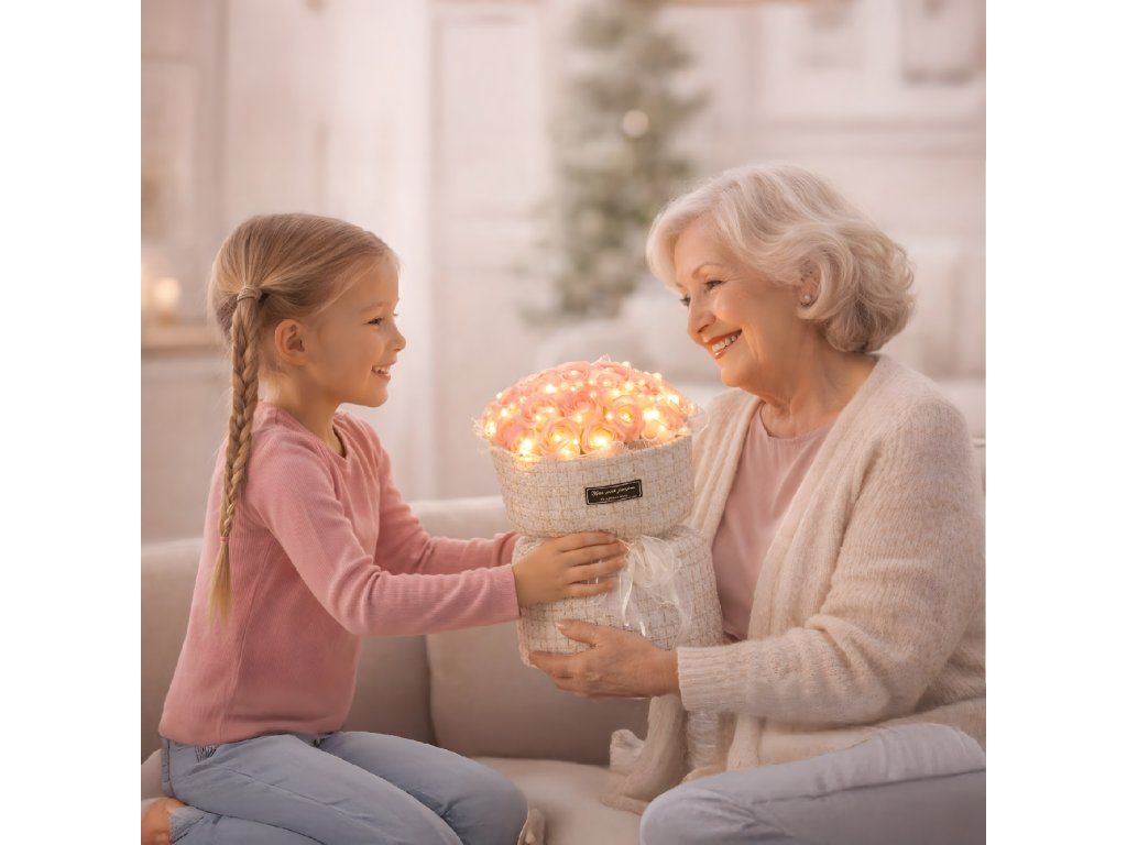 ➡️ Ano! Kytice obsahuje bateriové LED světýlka, která jí dodávají romantickou atmosféru.