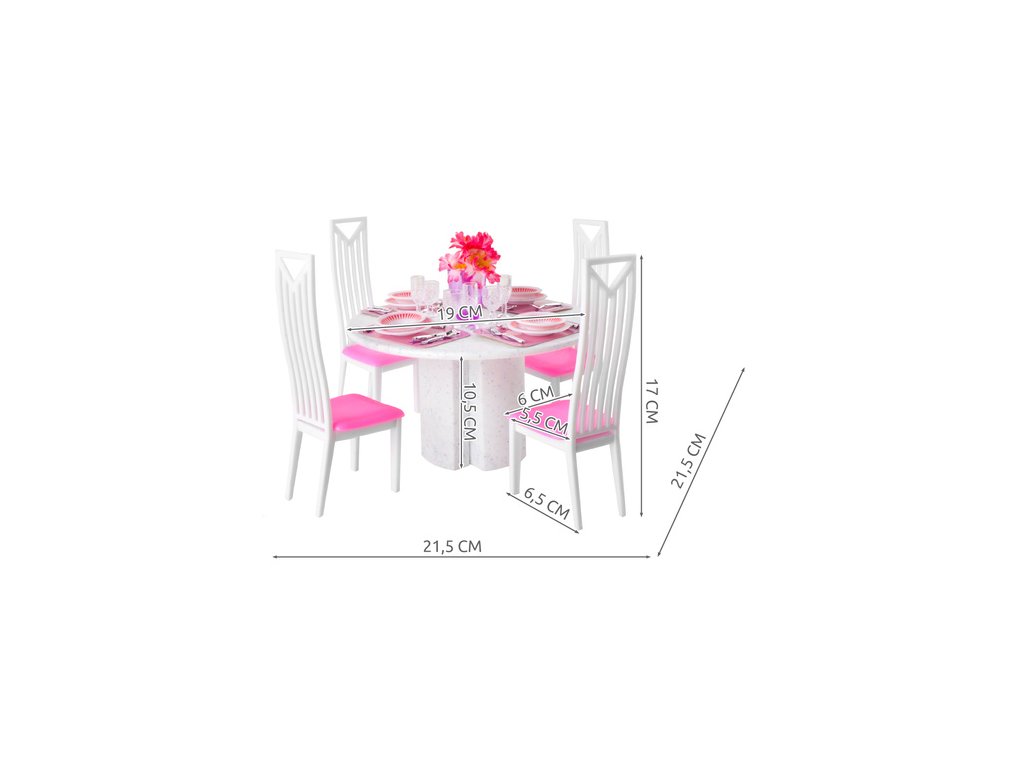 - Velká sada 43 dílků - kompletní jídelna v miniatuře – stůl, 4 židle, nádobí, příbory, sklenice a váza s květinami; sada zaručující hodiny kreativní hry.