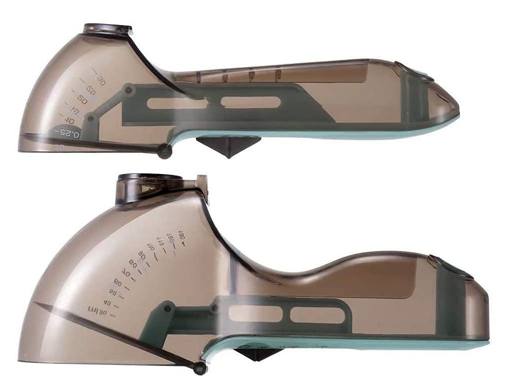 Sada obsahuje dvě odměrky - menší a větší . Díky prvnímu můžeme odměřit od 5 ml do 30 ml , od 1/2 do 3 čajových lžiček a od 1 do 2 polévkových lžic . Druhá odměrka měří od 30 ml do 130 ml , od 2 do 9 polévkových lžic a od 1/8 do 1/2 šálku.