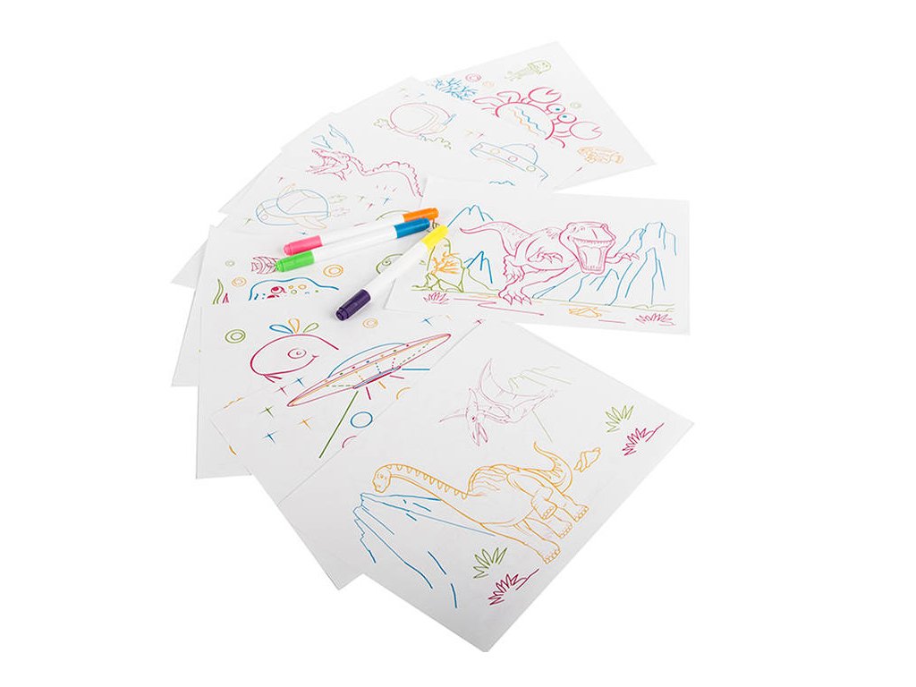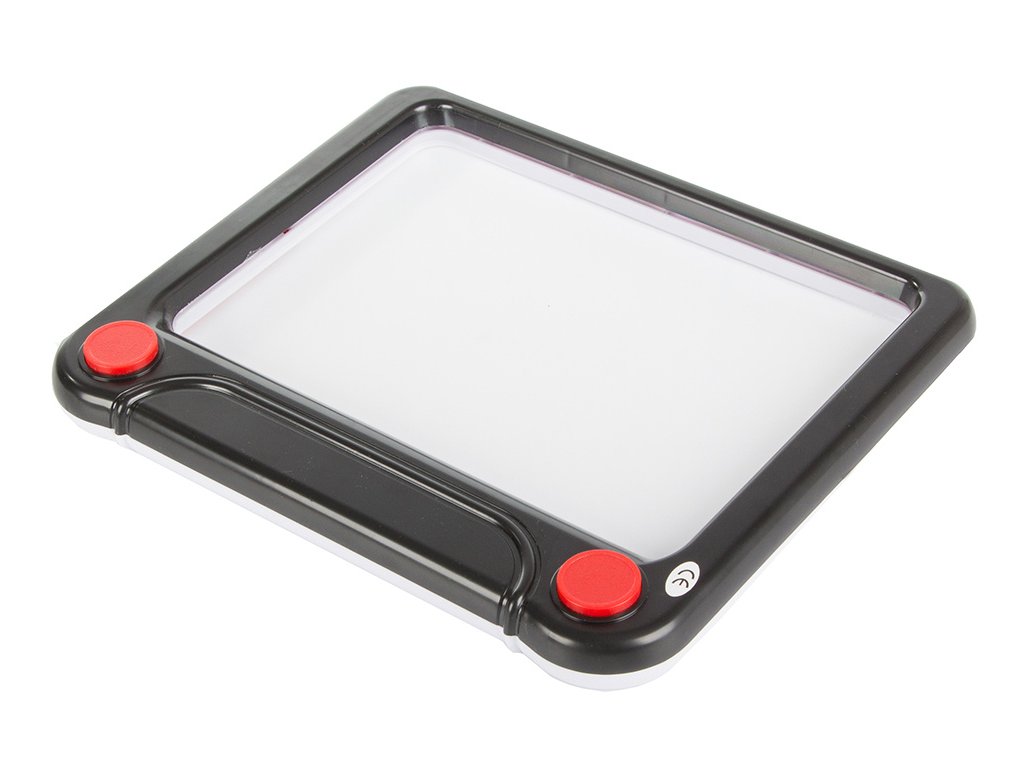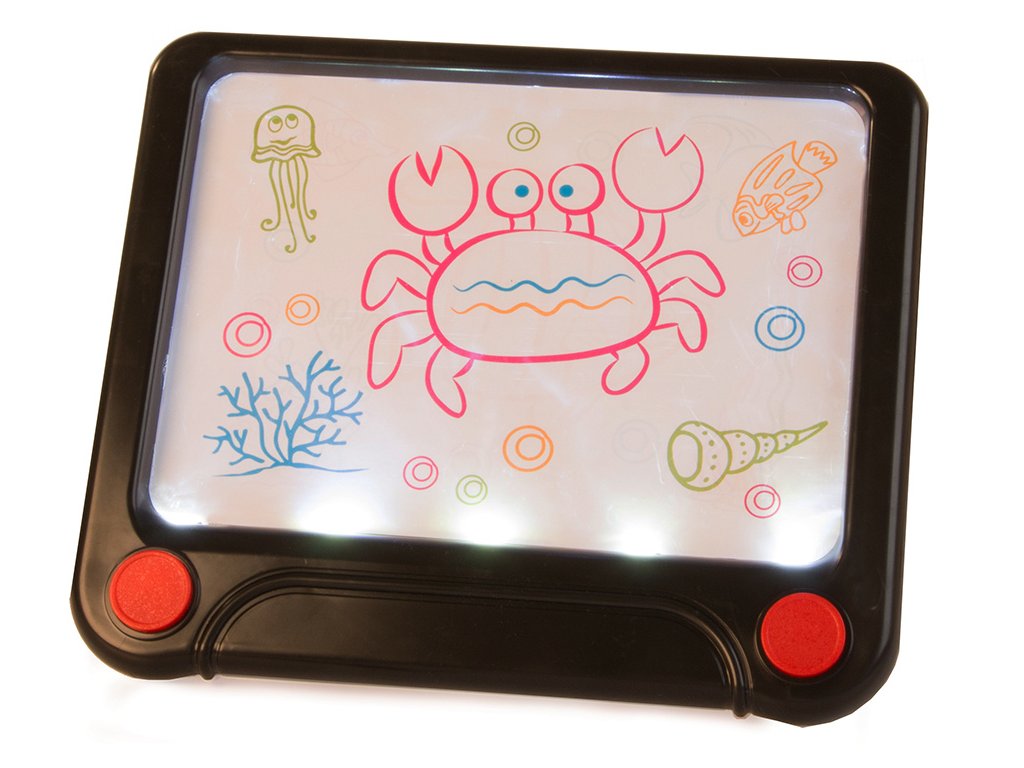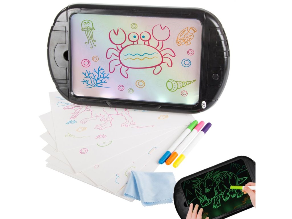 Tablet má průhlednou obrazovku pro kreslení se třemi oboustrannými magickými fixy.