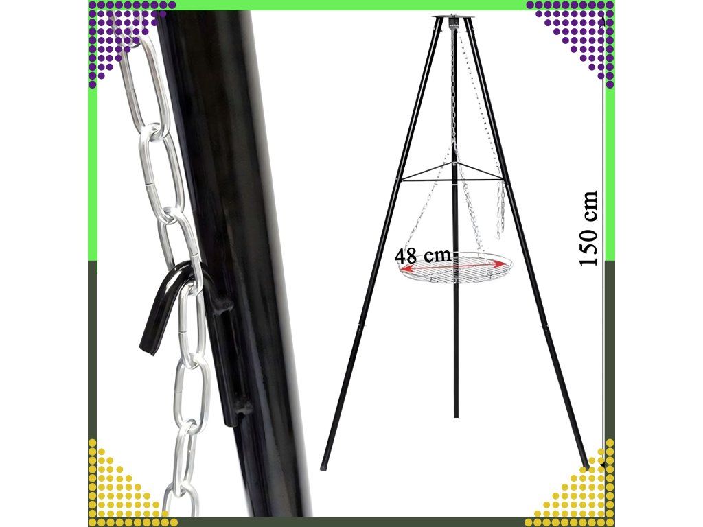 Standardně je výška trojnožky 150 cm a průměr roštu je přibližně 50 cm.